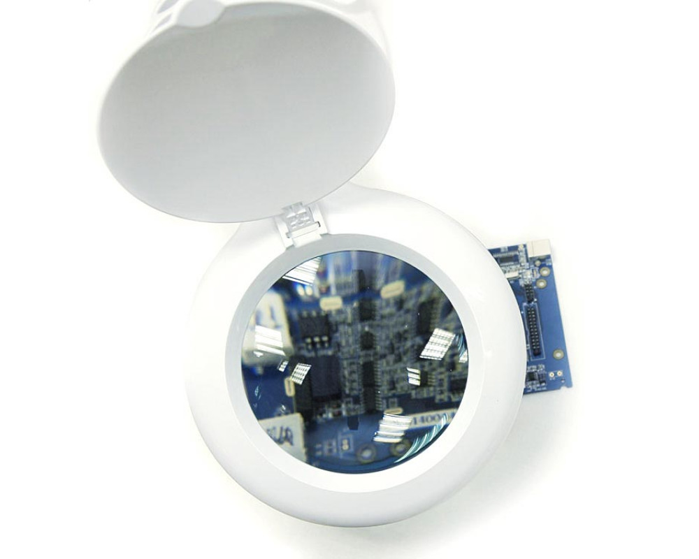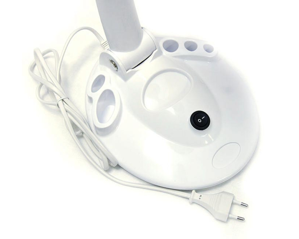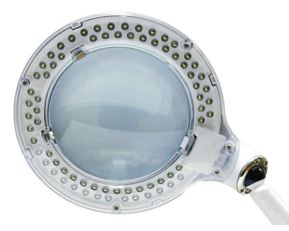 Бестеневой кольцевой светильник с 72 светодиодами в качестве источника освещения. Увеличение за счет двояковыпуклой линзы диаметром 127 мм. Оптическая сила линзы - 3 диоптрии (коэф. увеличения - 1,75). Настольное исполнение. Цвет: белый. Напряжение питания 220-240 В.