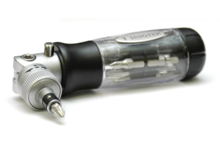 Отвёртка с изменяемым наклоном рукоятки (5 положений), храповым механизмом и отсеком в рукоятке для сменных насадок (M4 - 7х25 мм): прямой шлиц; крестовые Phillips; шестигранник; звёзда Torx; четырёхгранный адаптер. Мини-отвёртка с двумя двухсторонними прецизионными насадки (4х25 мм): SL2,0/PH00; SL1,5/PH0 и отделением для хранения насадок..