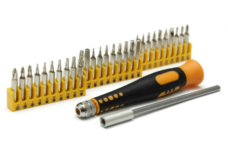 Набор прецизионных отверток 33 предмета: отвёртка с гибким 8" адаптером-удлиннителем под сменные насадки-битами (M2 - 4 мм): прямой шлиц (1,0; 1,5; 2,0; 2,5; 3,0; 3,5; 4,0); крестовые Phillips (PH000; PH00; PH0; PH1) и Pozidriv (PZ0; PZ1); шестигранник (H0,7; H0,9; H1,3; H1,5; H2,0; H2,5; H3,0; H4,0); звёзда Torx (T4; T5; T6; T7; T8; T9; T10; T15; ..