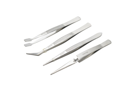 Набор из 4-х стальных пинцетов: с острыми концами; с самосжимающимися концами; с лопатками; с закруглёнными концами. Длина 4-3/4" (120 мм). Подходят для работы с мелкими деталями, ремонта печатных плат, вытаскивания деталей из труднодоступных мест. Удобный пластиковый чехол для хранения...