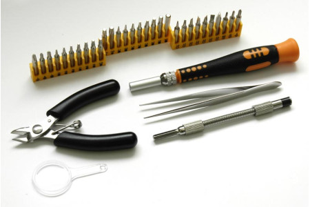Набор инструментов профессиональный: Отвертка с плоским шлицом 1/4". Отвертка с плоским шлицом 3/16 ". Крестовая отвертка PH2. Крестовая отвертка PH1. 10 минигаечных ключей. Оловоотсос. Монтажный паяльник. Подставка для паяльника. Набор для пайки из 3-х предметов. Пинцет. Захват. Прецизионные отвёртки - 6 шт. Теплоотвод. Ящик пластиковый с отсеками..