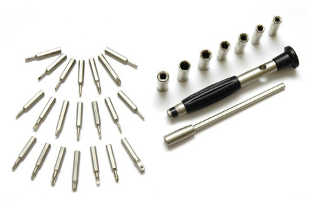 Отвёртка c храповым механизмом и сменными насадками (M4 - 7х25 мм): прямой шлиц; крестовые Phillips; шестигранник; звёзда Torx. Мини-отвёртка с двумя двухсторонними прецизионными насадки (M2 - 4х25 мм): SL2,0/PH00; SL1,5/PH0 и отделением для хранения насадок. Укороченная ручка для работы в труднодоступных местах. Усиленная ручка с отсеком для хране..