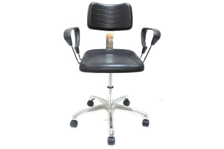 Кресло антистатического исполнения. Материал: вспененный полиуретан. Цвет: черный. Высота: 420 - 570 мм. Алюминиевое 5-ти лучевое основание с 5 колесами. Нерегулируемые подлокотники. Размер сиденья: 430 х 420 мм. Размер спинки: 360 x 220 мм. Сопротивление: 10..