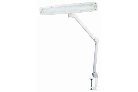 Светильник светодиодный без линзы. Источник освещения: 84 SMD светодиода. Мощность 21 Вт. Многофункциональный переключатель (4 кнопки) с регулятором силы света. Крепление к столу струбциной. Пантографический механизм. Адаптер питания внешний. Цвет белый...