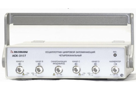 4-х канальный осциллограф - внешняя приставка к ПК, 100 МГц, дискретизация 8 бит/ 100 MS/s-10 GS/s, коэфф. отклонен. 2 мВ/дел - 10 В/дел., коэф. развертки 0,01 мкс/дел - 100 ч/дел., макс. вх. напряжение ±100 В, входы 1 МОм/50 Ом, режим самописца, анализатор спектра, цифровая фильтрация, вх. внешн. синхронизации, калибратор, USB 1.1., гальваническая..