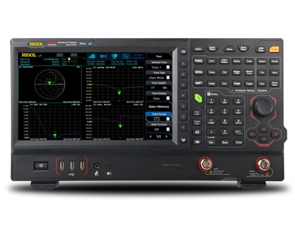 Режимы: анализатор спектра (GPSA) и анализатор спектра реального времени (RTSA), векторный анализатор (VNA). Полоса от 9 кГц до 6,5 ГГц. Технология UltraReal. Погрешность опорного генератора: 1 ppm (0,1 ppm). GPSA: полоса обзора: нулевая, от 10 Гц. до макс. частоты; разрешение 1 Гц; фильтр ПЧ: 1 Гц…10 МГц, ЭМС фильтры; видеофильтр: 1 Гц…10 МГц; фазовый шум: -115 дБн @ 1 МГц; средний уровень собственного шума DANL: -145 дБм (без п/у), -163 дБм (с п/у, опция); диапазон измерения: DANL...+30 дБм. RTSA: полоса захвата 25 МГц (40 МГц опция); мин. длительность событий 7,45 мкс, SFDR <-60 дБн, 6 типов окон. VNA: тип S11, S21, DTF, полоса 1 кГц-10 МГц. Трекинг-генератор: частотный диапазон 100 кГц - 6,5 ГГц, выходной уровень -40 дБм...0 дБм. Цветной дисплей 10,1" (1024х600). Интерфейсы LAN, USB, HDMI. Размеры 410 х 224 х 135 мм, масса 4,65 кг.