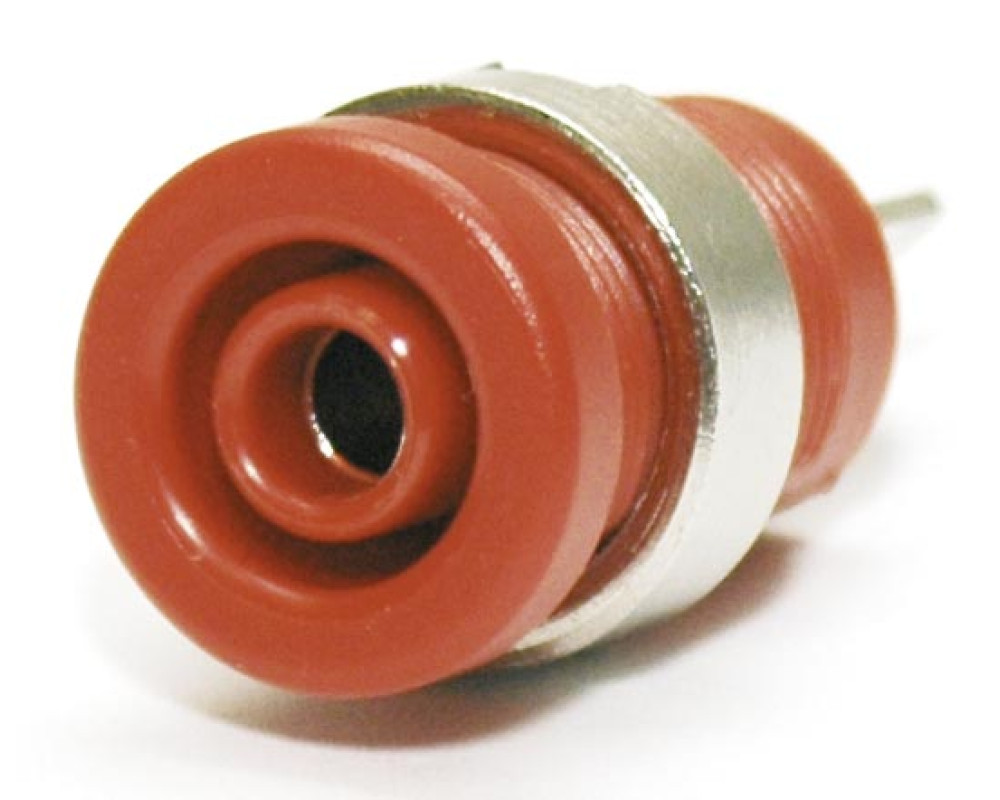 Гнездо (розетка) с внутренним диаметром 4 мм, с гаечным соединением и контактным отверстием диаметром 2 мм, скрытым отворачивающейся изолированной гайкой. Гаечное крепление с шайбой диаметром 7 мм, длина изолированной части 20 мм, общая длина 45 мм. Цвет красный...