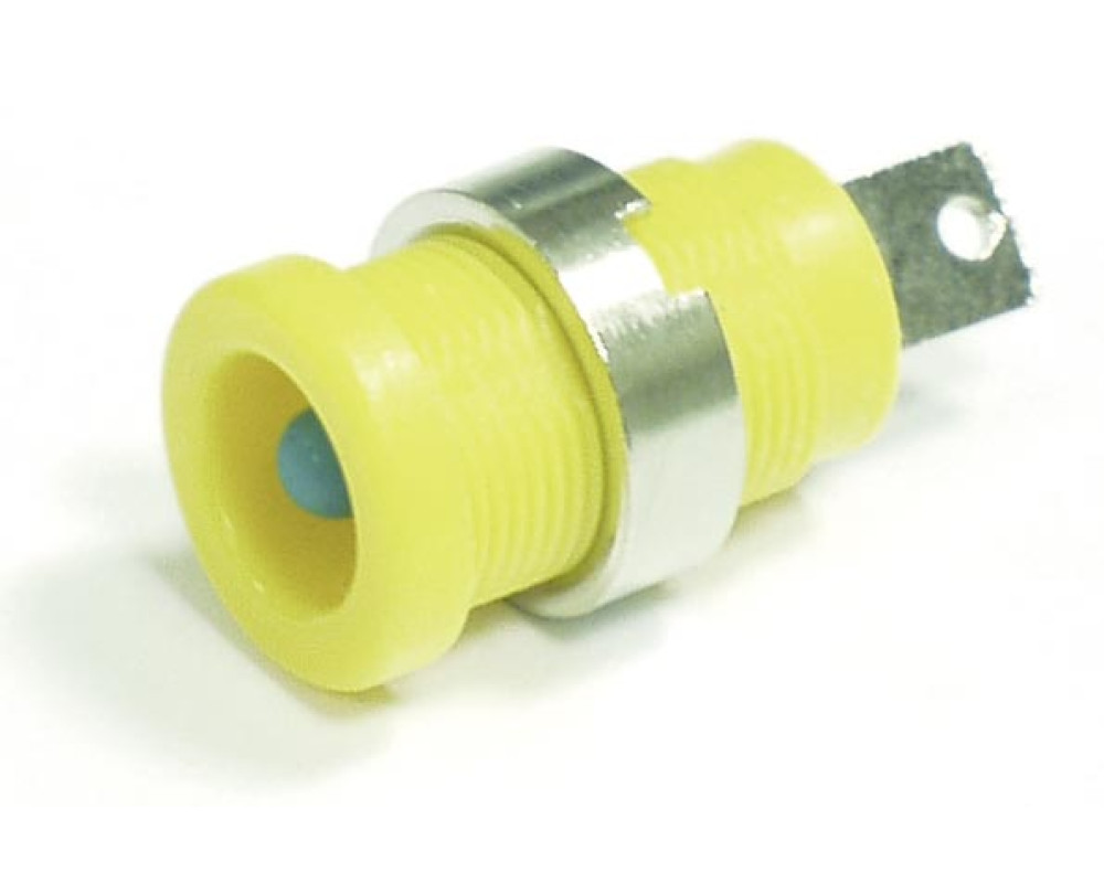 Гнездо внутренним диаметром 4 мм с двойной изоляцией с гаечным креплением и ножевым соединением (пластина 6мм*8,5мм с центральным отверстием). Высота пластиковой части 23 мм, внешний диаметр 12 мм. Защита по CAT 3, максимальный ток 25 А, максимальное напряжение 1000 V, контактное сопротивление не более 5 мОм. Цвет желтый..