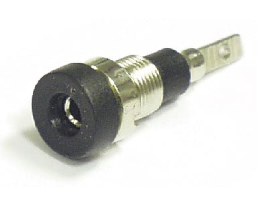 Гнездо (розетка) с внутренним диаметром 2 мм, с ножевым соединением. Гаечное крепление с шайбой, диаметр 6 мм, длина 11 мм, общая длина 24 мм. Цвет черный.