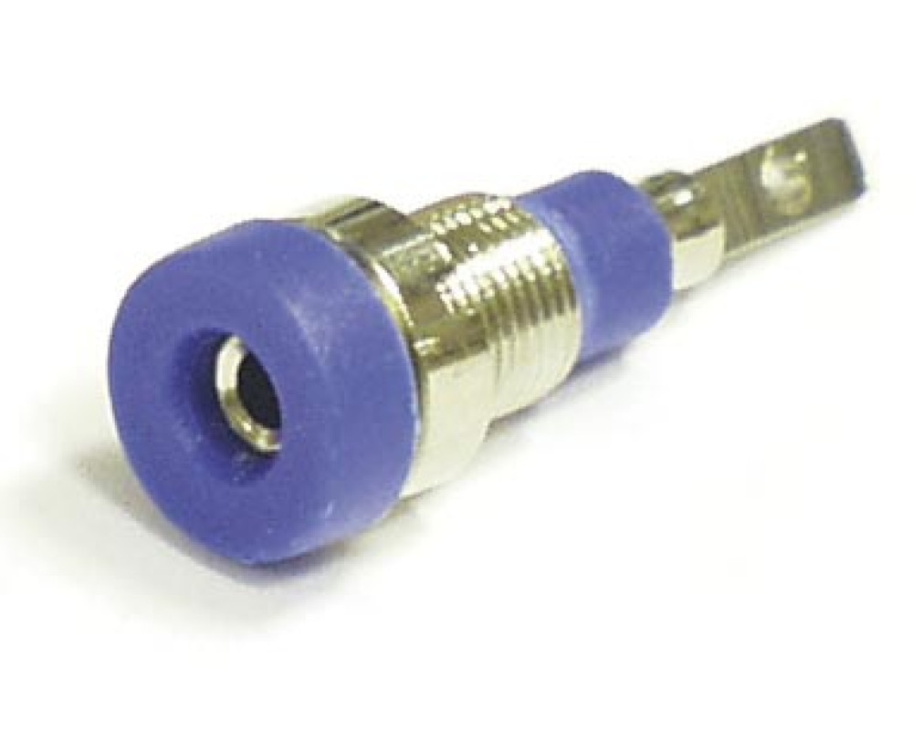 Гнездо (розетка) с внутренним диаметром 2 мм, с ножевым соединением. Гаечное крепление с шайбой, диаметр 6 мм, длина 11 мм, общая длина 24 мм. Цвет синий.