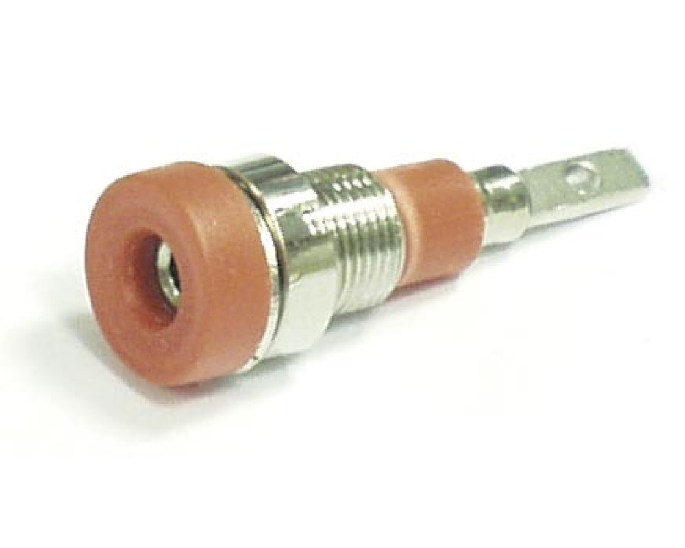 Гнездо (розетка) с внутренним диаметром 2 мм, с ножевым соединением. Гаечное крепление с шайбой, диаметр 6 мм, длина 11 мм, общая длина 24 мм. Цвет красный