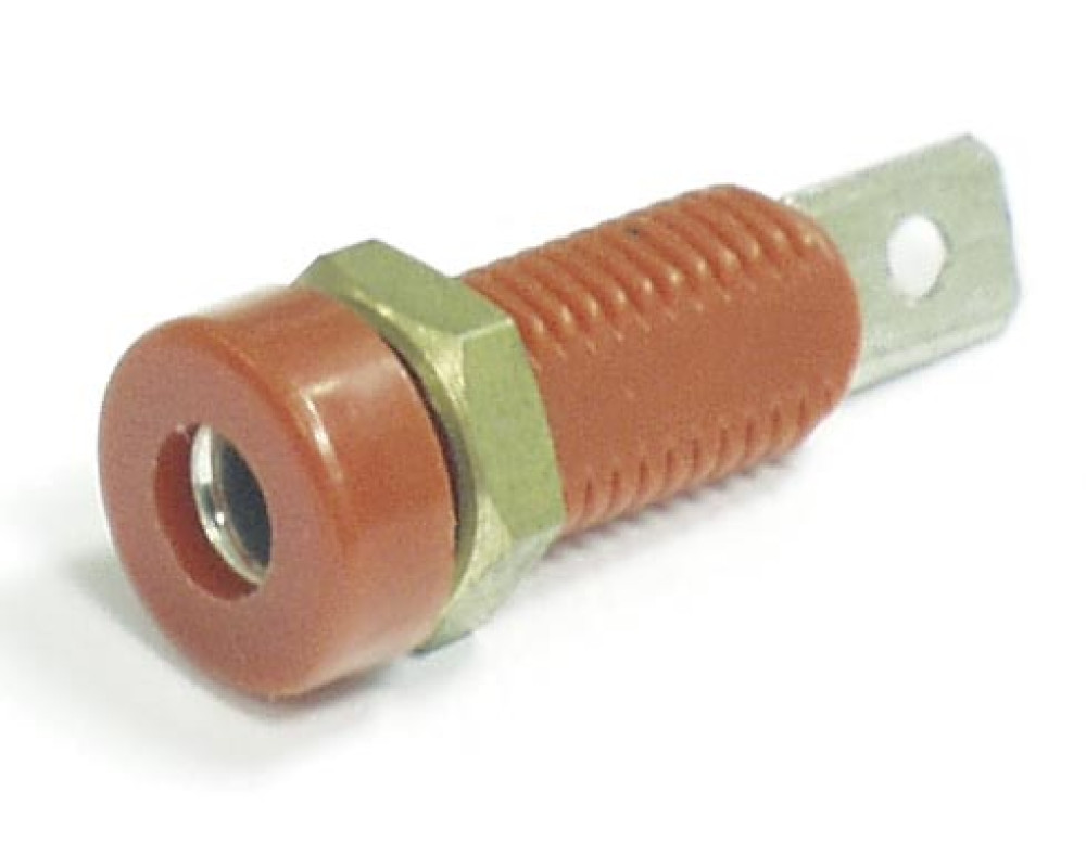 Гнездо (розетка) с внутренним диаметром 4 мм, с ножевым соединением с контактным отверстием диаметром 2 мм. Гаечное крепление с шайбой, общая длина 28 мм. Цвет красный