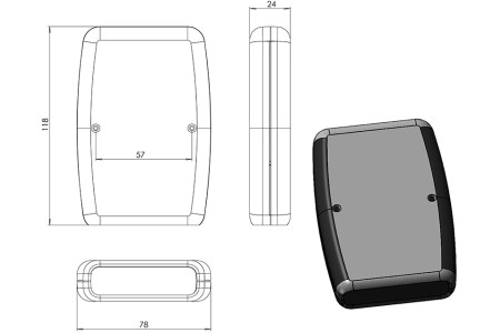 Корпус пластиковый с прорезиненными сторонами. Цвет прорезиненных сторон - серый. Размеры 118х78х24 мм. Имеет батарейной отсек. Одна сменная (вставная) боковая панель...