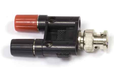 Адаптер-переходник BNC папа – 2 гнезда 4мм (черное – «земля» и красное) с возможностью клеммного прижимного соединения. Есть 2 ответвительных гнезда 4мм для параллельного подключения дополнительных кабелей. Длина штекеров 15мм, расстояние между штекерами 19 мм, длина разъема BNC 17мм. Длина корпуса 26 мм. Цвет: черный..
