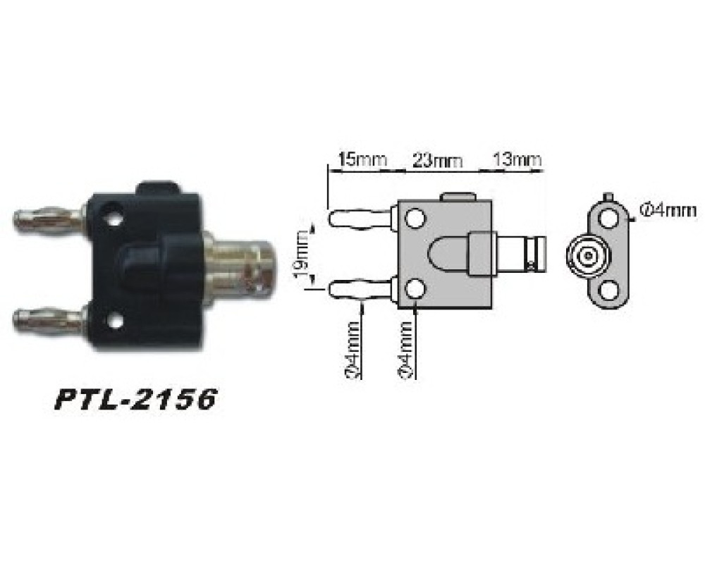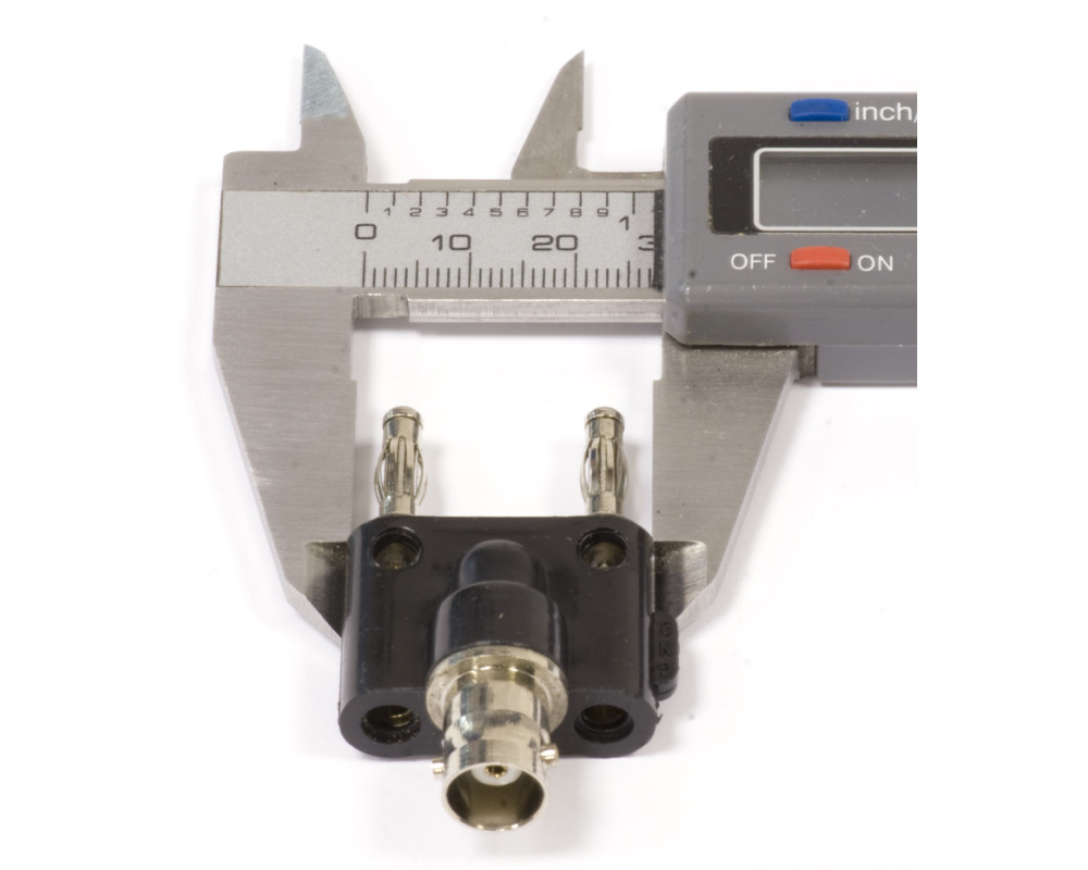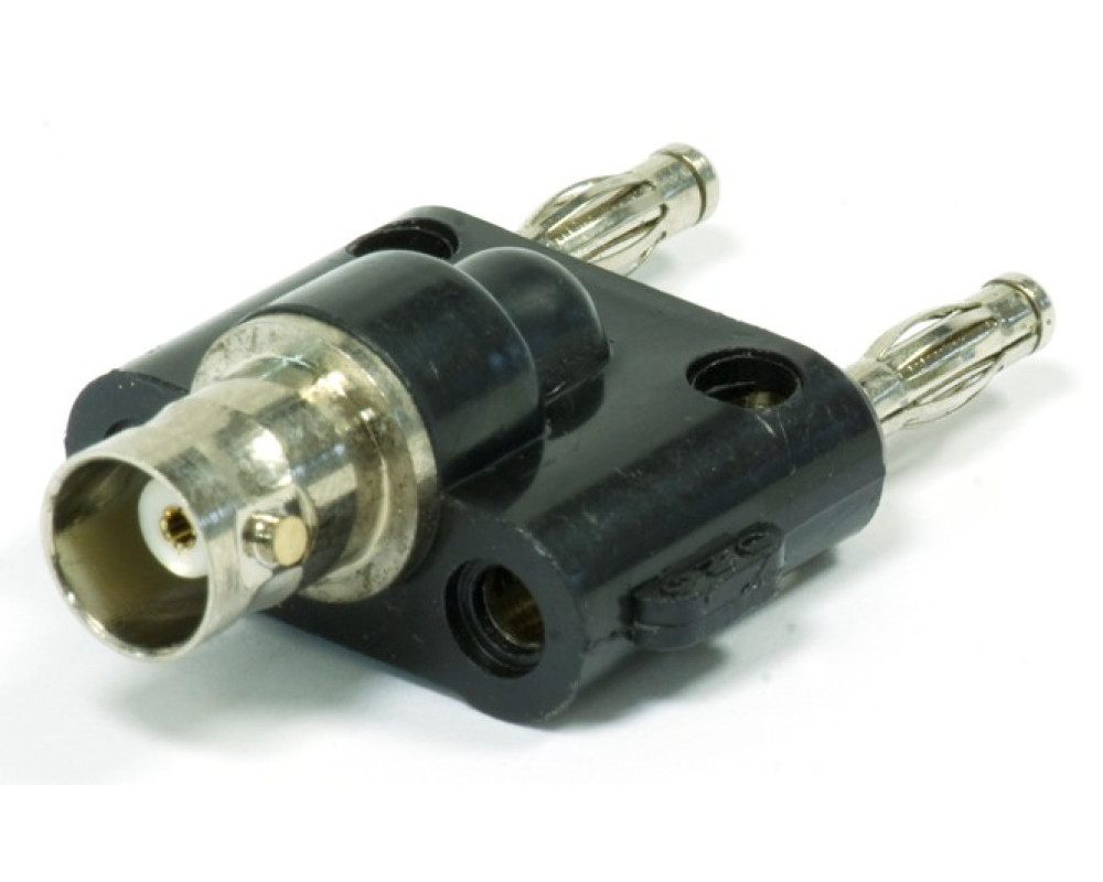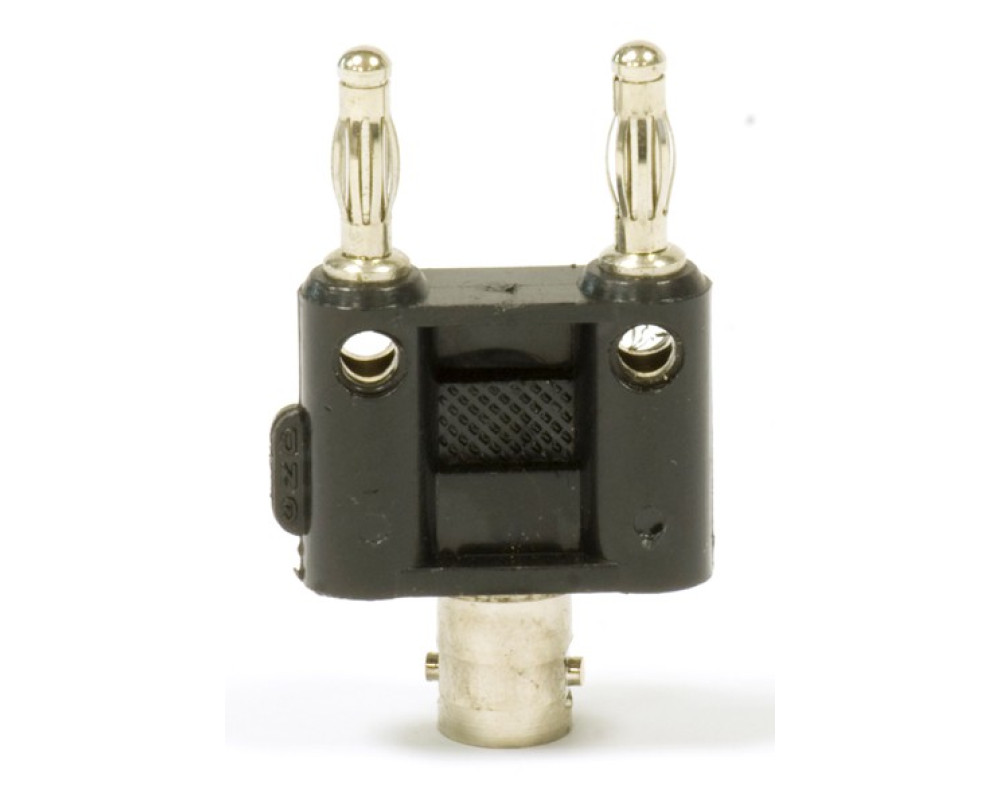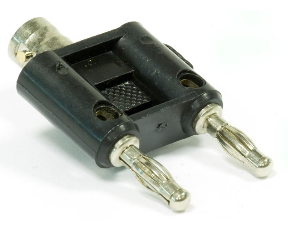 Адаптер-переходник BNC мама – 2 штекера 4мм. Штекеры типа «банан» подпружиненные по всей длине для обеспечения надежного и постоянного контакта. Есть 2 ответвительных гнезда 4мм для параллельного подключения других штекеров. Длина штекеров 15мм, расстояние между штекерами 19 мм, длина разъема BNC 13 мм. Длина корпуса 23 мм. Цвет: черный