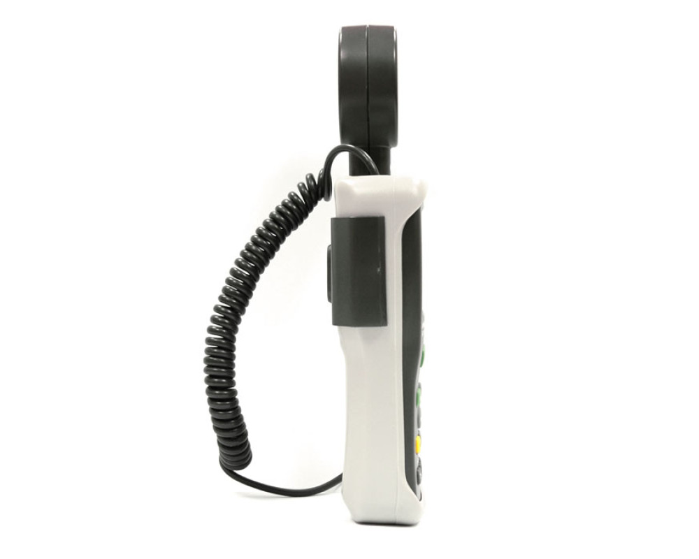 Чашечный анемометр с выносным датчиком. Макс. диаметр чашек датчика- 72 мм. Диапазон измерения 0,9-35 м/с, температуры 0...50°С. Измерение температуры при помощи термопар К и J типа -100...1300°С. Удержание показаний, Min, Max. Сохранение на SD-карту в реальном времени. Интерфейс RS-232/USB. Питание 9 В (6 бат АА). Габариты: прибора 182x73x47.5 мм..