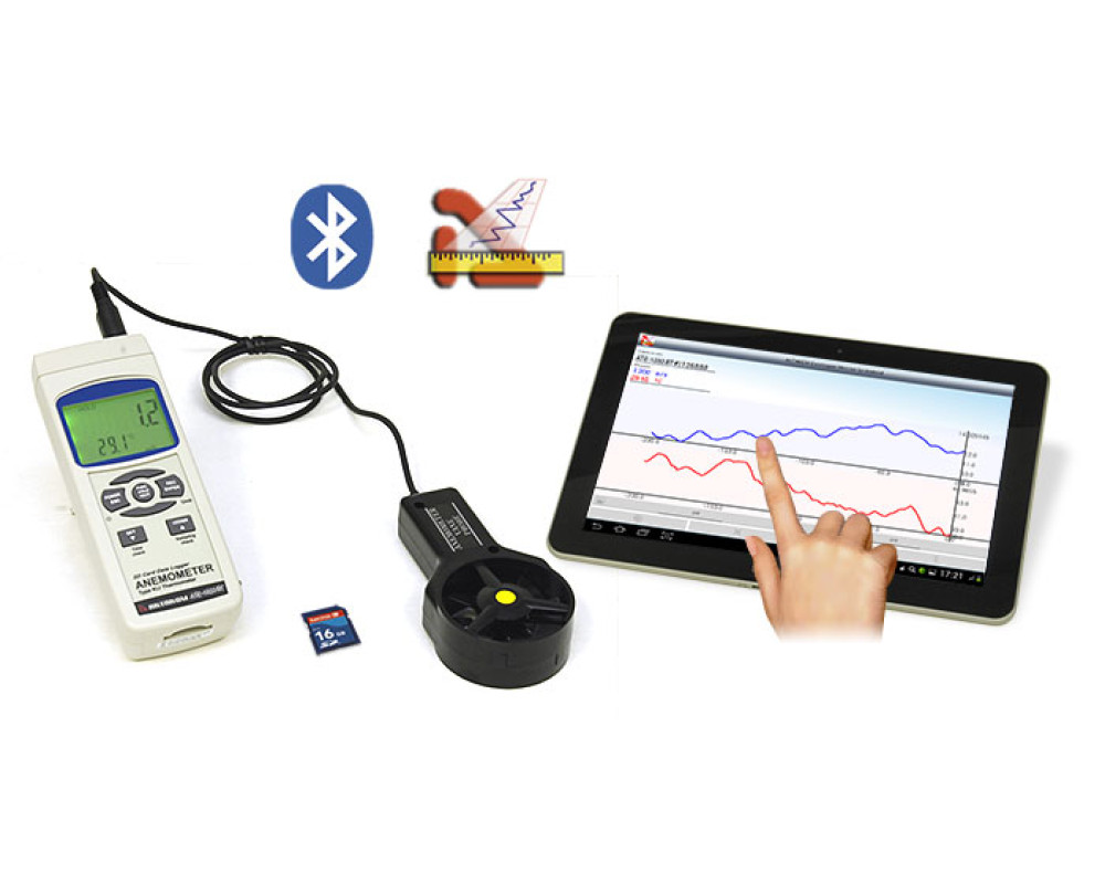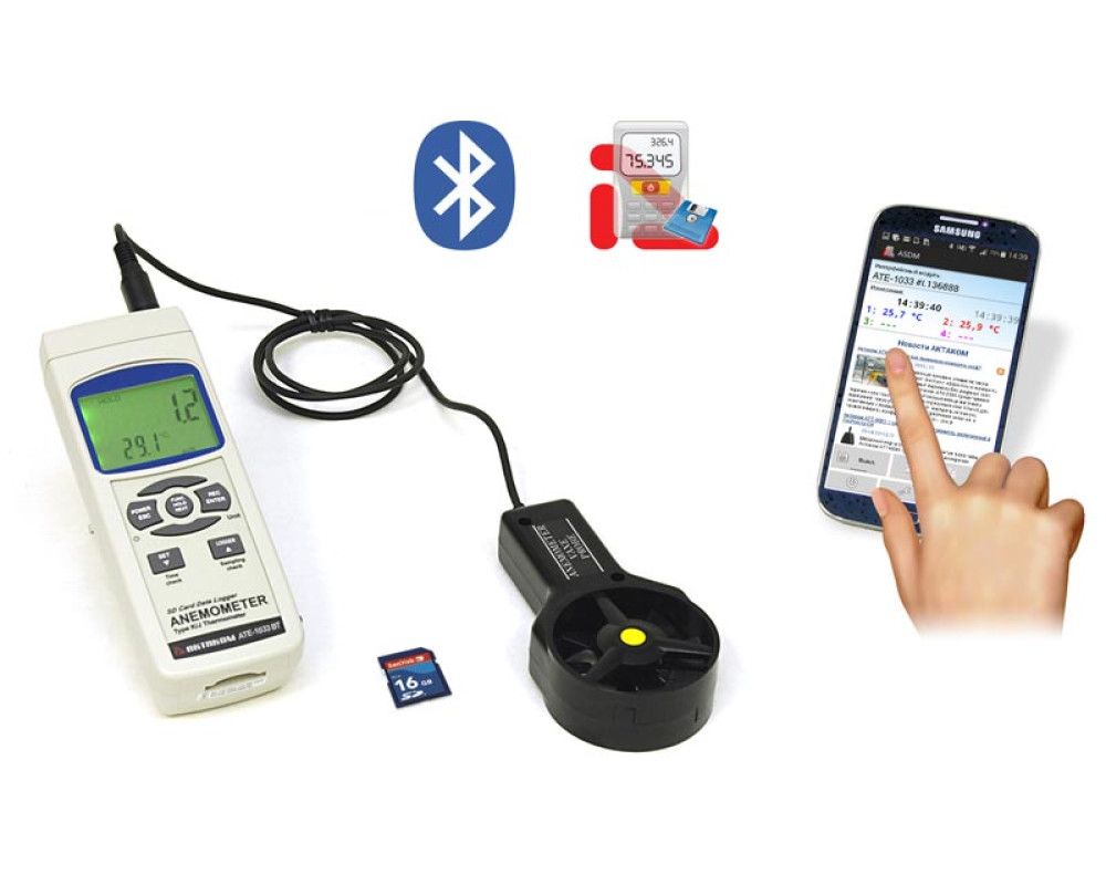 Крыльчатый анемометр с выносным датчиком для измерения скорости потока воздуха 0,4-30 м/с и температуры 0...50 °С. Измерение температуры при помощи термопар К и J типа -100...1300 °С. Удержание показаний, Min, Max. Сохранение на SD-карту в реальном времени. Интерфейс RS232 с возможностью подключения к ПК через порт USB с помощью преобразователя интерфейса АКТАКОМ АСЕ-1025 и широкой программной обработкой данных с помощью программы ADLM-W с использованием ОС Windows. Bluetooth интерфейс обеспечивает возможность беспроводного соединения для отображения и регистрации данных на любом мобильном устройстве, содержащем данный интерфейс, ОС Android не ниже 4.0 (API Level: 14) и программное обеспечение ASDM (бесплатное приложение) и ASDL (более функциональное, платное ПО). Габариты: 203х76х38 мм. Масса: 515 г.