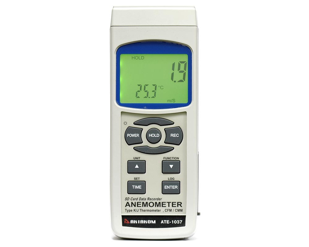 Чашечный анемометр с выносным датчиком. Макс. диаметр чашек датчика- 72 мм. Диапазон измерения 0,9-35 м/с, температуры 0...50°С. Измерение температуры при помощи термопар К и J типа -100...1300°С. Удержание показаний, Min, Max. Сохранение на SD-карту в реальном времени. Интерфейс RS-232/USB. Питание 9 В (6 бат АА). Габариты: прибора 182x73x47.5 мм..