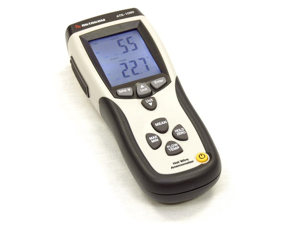 Анемометр с выносным датчиком для измерения скорости потока воздуха 0,5-20 м/с. Погрешность: ±(0,2+0,05V) м/с. Измерение температуры воздушного потока в диапазоне 0-50 °С (индикаторный канал). Удержание показаний. Интерфейс RS-232 с возможностью подключения к ПК через порт USB с помощью преобразователя интерфейса АКТАКОМ АСЕ-1026 и широкой программ..