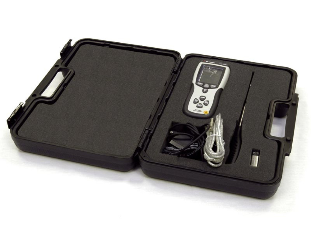 Крыльчатый анемометр с выносным датчиком. Тип датчика - металлическая крыльчатка диаметром 72 мм. Диапазон измерения 0,4-30 м/с, температуры 0...50°С. Вычисление объема воздушного потока до 63000 куб.м/мин. Измерение температуры при помощи термопар К и J типа -100...1300°С. Измерение влажности 5 % .. 95 % R.H., точки росы. Удержание показаний, Min,..