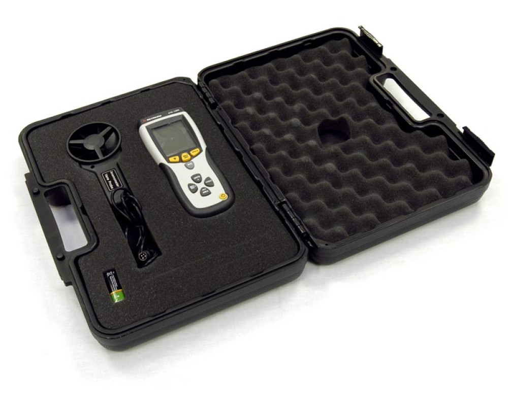 Крыльчатый анемометр с выносным датчиком. Тип датчика - металлическая крыльчатка диаметром 72 мм. Диапазон измерения 0,4-30 м/с, температуры 0...50°С. Вычисление объема воздушного потока до 63000 куб.м/мин. Измерение температуры при помощи термопар К и J типа -100...1300°С. Измерение влажности 5 % .. 95 % R.H., точки росы. Удержание показаний, Min,..