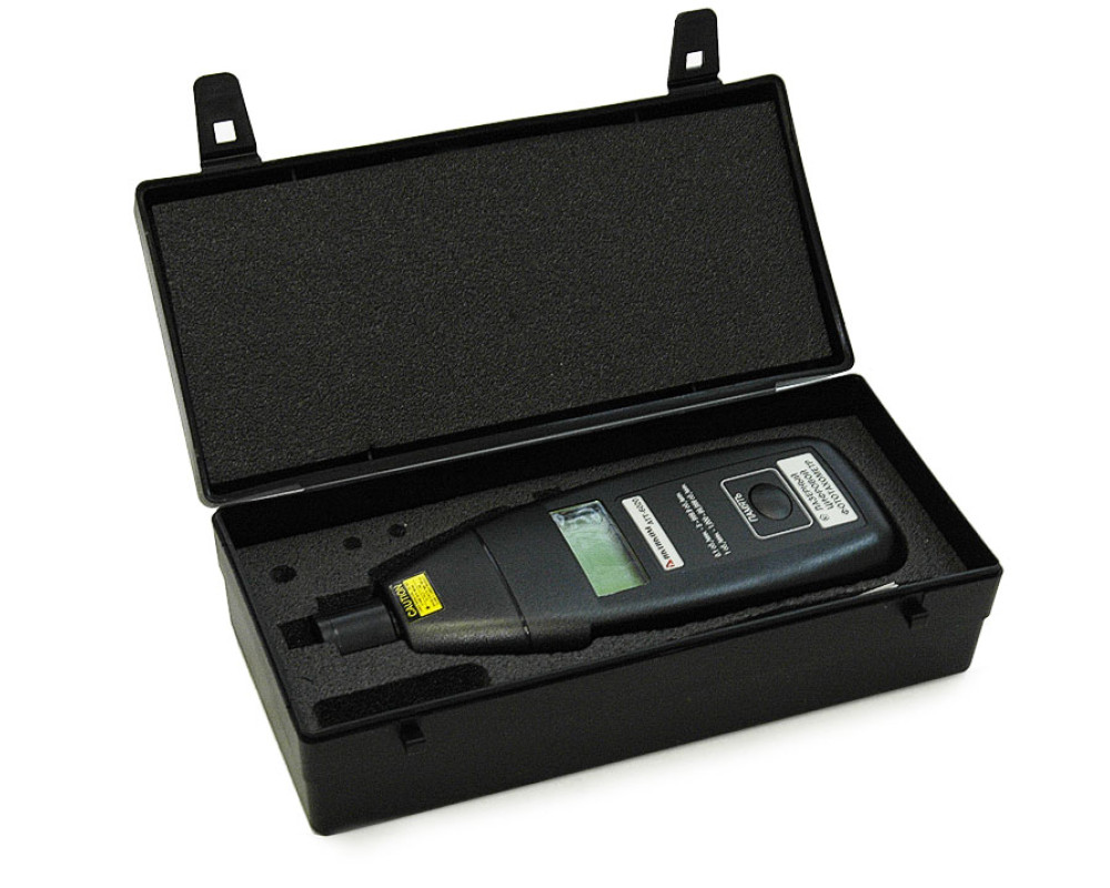 Цифровой тахометр (фотодатчик). Диапазон измерений от 5 до 99999 об/мин. Разрешение 0,1/1 об/мин. Погрешность 0,1%. Измерение на расстоянии от 50 до 150 мм. Питание: 4 х1,5 В (АА). Габариты: 190х72х37 мм, вес 235 г.