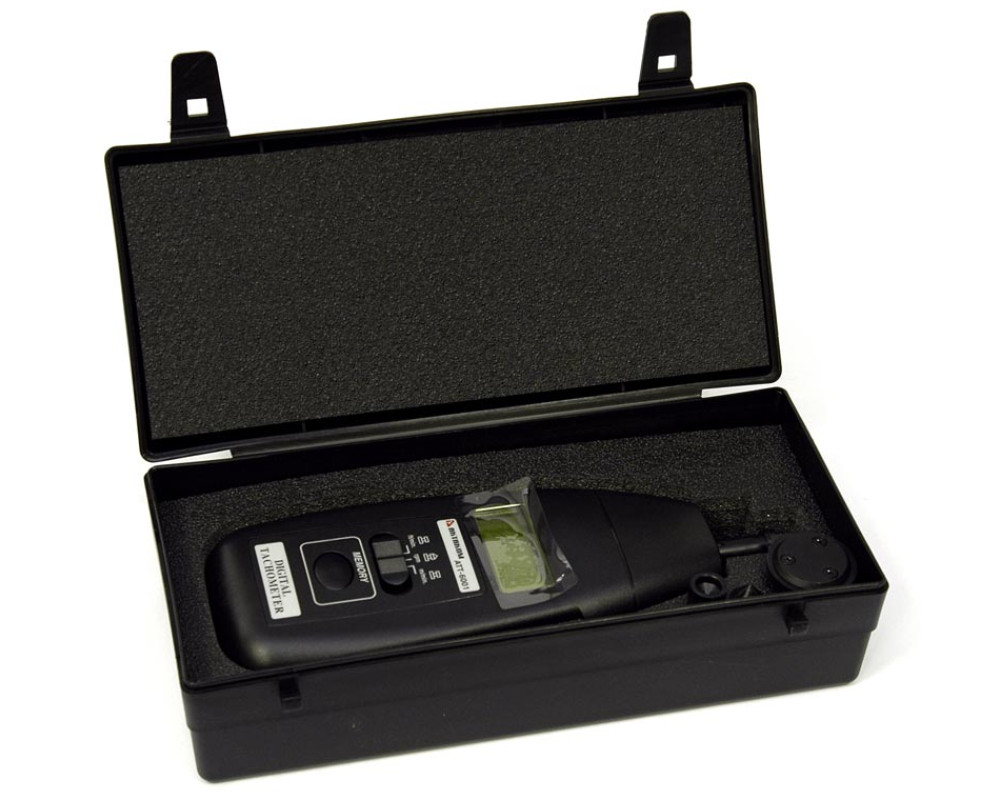 Цифровой тахометр (контактный) в диапазоне от 10 до 19999 об/мин. Разрешение: 0,1 об/мин (<1000 об/мин), 1 об/мин (>1000 об/мин). Погрешность: 0,1%. Память: минимальное, максимальное и последнее значение. Питание: 6 В, 4 батареи (тип АА). Габаритные размеры: 208x72x37 мм. Масса: 0,28 кг.
