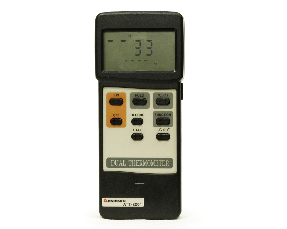 Двухканальный измеритель температуры. Возможность измерения разности температур. Функция удержания показаний, фиксация максимального и минимального значений. Диапазон измерений от -50 °С до 1230 °С. Работает с термопарой К-типа. Автоматоматическое переключение полярности. Компенсация холодного спая. Базовая погрешность 1%+1 °С. Термопара поставляется отдельно.