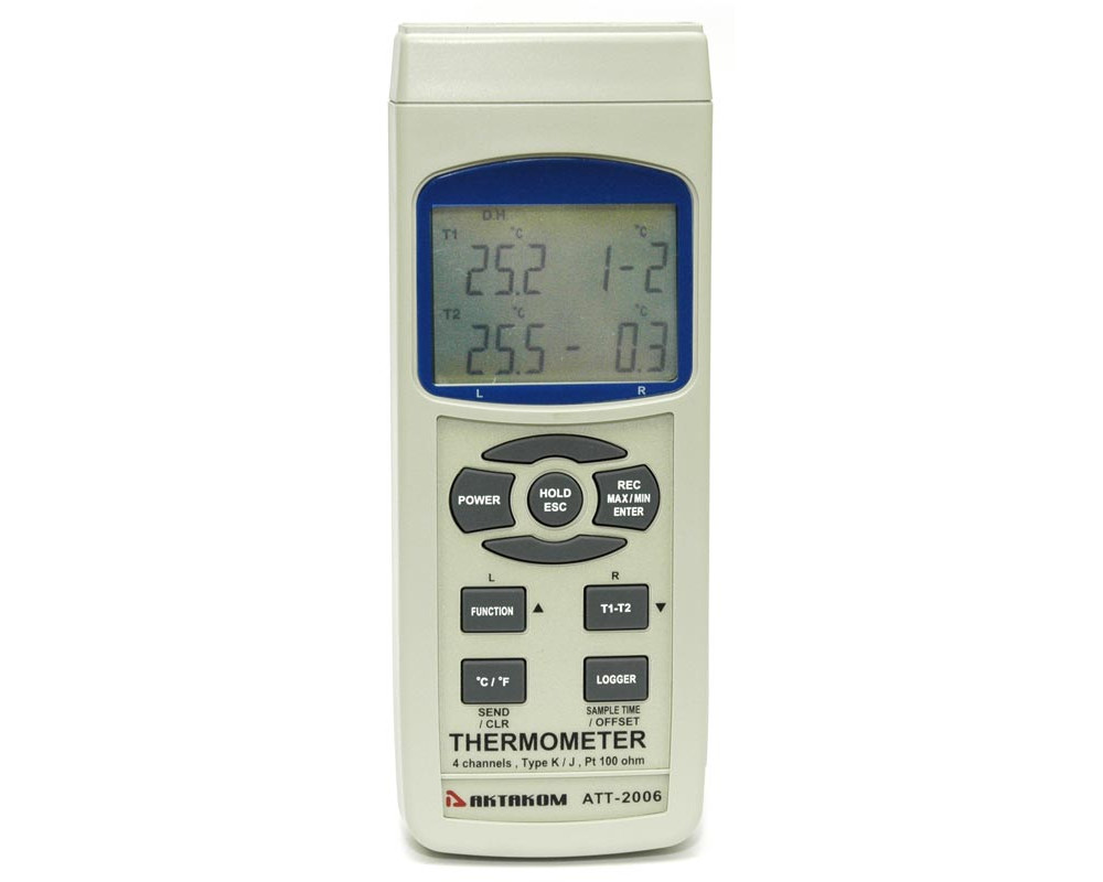 Четырехканальный измеритель температуры. ЖК-дисплей 52х38 мм, отображение измеренных значений по 4-м каналам одновременно. Разрешение: 0.1 °C. Каналы: T1, T2, T3, T4, T1-T2. Совместим c термопарами K и J-типа. Диапазон измерений термопарой К-типа: -199.9...1370 °С, J-типа: -199.9...1200 °С, Pt-типа: -199.9...850 °С. Удержание значения, запись (макс, мин). Время сэмплирования 1 сек. Интерфейс RS-232 с возможностью подключения к ПК через порт USB с помощью преобразователя интерфейса АКТАКОМ АСЕ-1025 и широкой программной обработкой данных с помощью программ ADLM-W или ADLM-A с использованием ОС Windows или Android соответственно. Сохранениев памяти до 16 тыс.значений. Габариты: 174х68х42 мм.