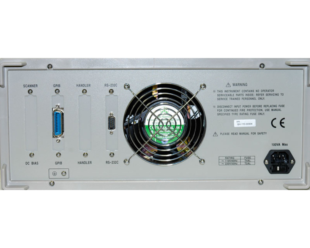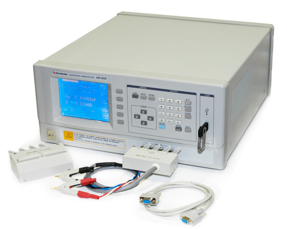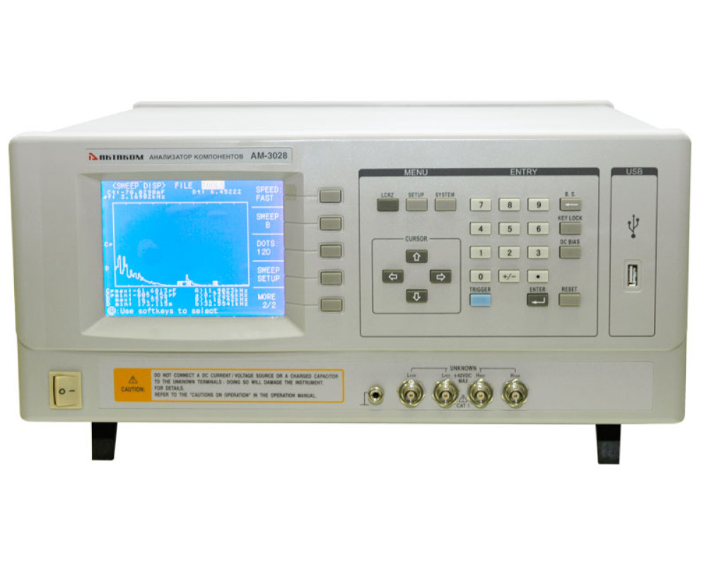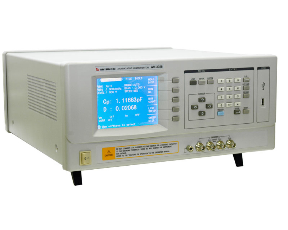 Базовая погрешность 0,05%. Тест. частота 20 Гц…1 МГц (с шагом 1 мГц). Измерения: сопротивление |Z|/R/Rp/Rs/X (0,00001 Ом…99,9999 МОм); ёмкость C (0,00001 пФ…9,99999 Ф); индуктивность L (0,00001 мкГн…99,9999 кГн); проводимость |Y|/G/B (0,00001 мкСм…99,9999 См); тангенс угла потерь D (0,00001…9,99999); добротность Q (0,00001…99999,9); угол° (0°…±179,999°)/rad (0…±3,14159 рад), отн. измерения 0%...±999,999%. Функции: индикатор уровня тест-сигнала (V/I); сортировка; табличные измерения; графический анализ АЧХ; компаратор: 10 ячеек + 1; качание частоты: по 10 точкам. Дисплей: 6 разрядов; 320х240 (абсолютное значение/ относительное/ относительное в %). Уровень тест-сигнала 5 мВ…2,0 В / 50 мкА…20 мА. Импеданс: 30; 100 Ом. Скорость измерений: 1,5; 10; 30 изм./с. Калибровка: КЗ / открытая / под нагрузкой. Усреднение: 1-255. Запуск: непрер. / ручной / внешний / по шине. Память: 20 профилей настроек. Интерфейсы: USB (Host) / RS-232C / Handler (опц.). Габаритные размеры: 490х430х185 мм. Масса: 15 кг.