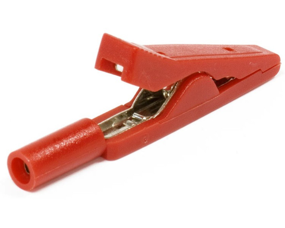 Насадка-крокодил. Входное гнездо диаметром 2 мм. Размеры: общая длина 41 мм, ширина 6,5 мм. Цвета: красный / черный.