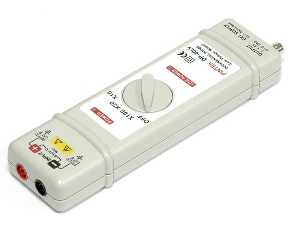 Дифференциальный пробник: позволяет гальванически развязывать каналы осциллографа. Частота до 40 МГц. Макс. входное напряжение 650 В. Входной импеданс 2 МОм/1,7 пФ. Коэффициенты деления 10/20/100. Питание внешний источник 6-9 В.
