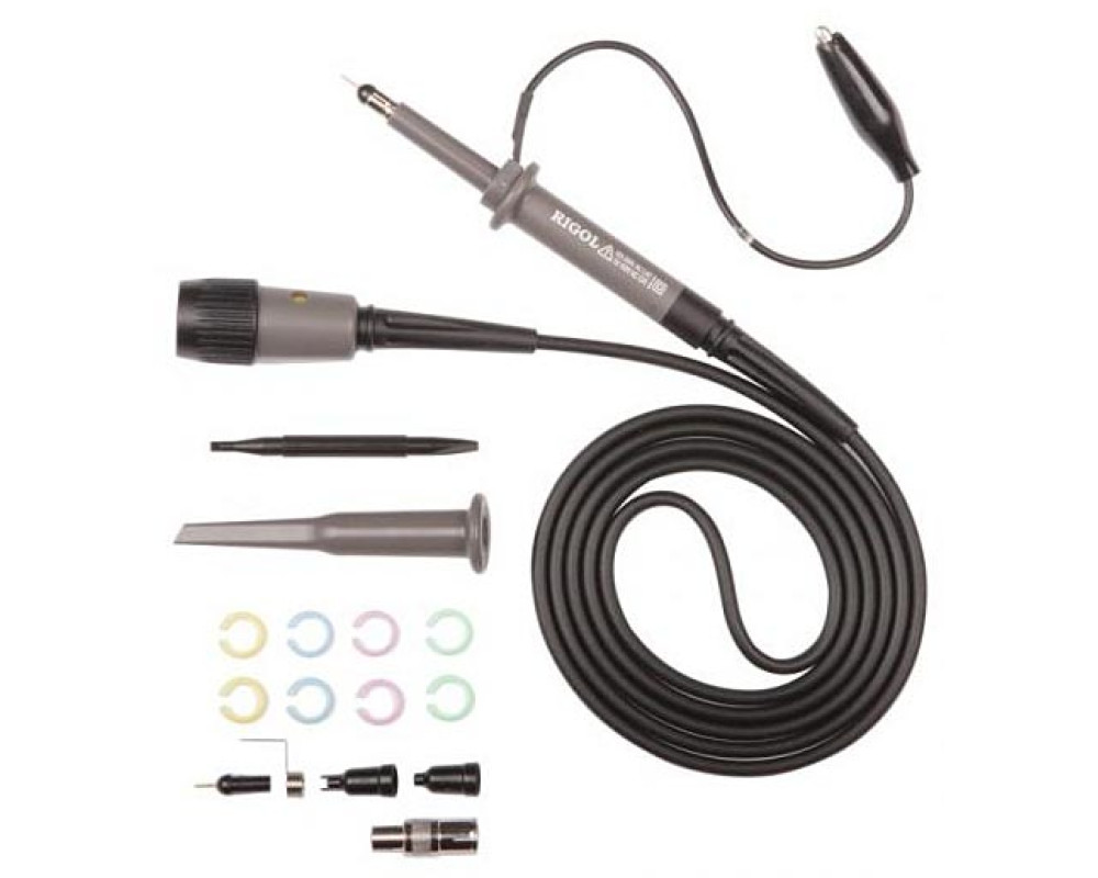 Пробник пассивный высокоимпедансный DC-350 МГц (10x) /DC-35 МГц (1x), коэф. ослабления 1x/10х, макс. входное напряжение 300 Вскз CAT II (10x)/ 150 Вскз CAT II (1x), входной импеданс 10 МОм (10x) /1 МОм (1x); входная емкость 10 пФ (10x) /50 пФ (1х). Диапазон компенсации 10 пФ...25 пФ. Длина провода 120 см. Для всех серий осциллографов Rigol...