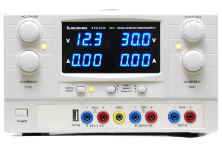 2x30 В, 2x3 А. 5В/3А. Максимальная мощность 195 Вт. Линейный. 3 канала (2 регулируемых, 1 фиксированный). 4 цифровых 3-х разрядных LED дисплея. Последовательное (60 В / 3 А) и параллельное (30 В / 6 А) соединение регулируемых каналов. Трекинг режим. Габаритные размеры 315x255х155 мм. Вес 8 кг..