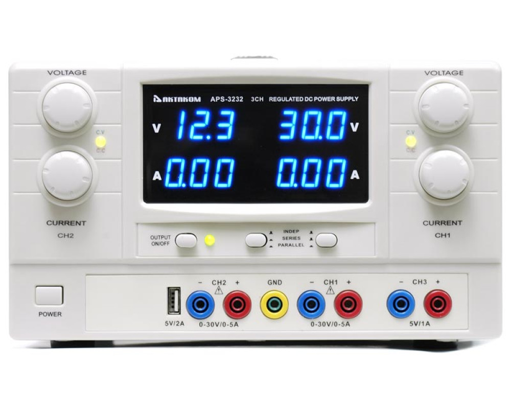 2x30 В, 2x5 А. 5В/3А. Максимальная мощность 315 Вт. Линейный. 3 канала (2 регулируемых, 1 фиксированный). 4 цифровых 3-х разрядных LED дисплея. Последовательное (60 В / 3 А) и параллельное (30 В / 6 А) соединение регулируемых каналов. Трекинг режим. Габаритные размеры 315x255х155 мм. Вес 9,5 кг.