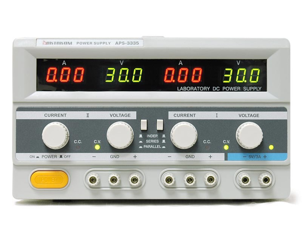 3 канала: 2 регулируемых канала по 30 В, 5 А; 1 нерегулируемый канал 5 В, 3 А. Макс.мощность 315 Вт. 4 цифровых 3-разрядных дисплея. Разрешение 0,1 В / 0,01 А. Последовательное и параллельное соединение регулируемых каналов. Габаритные размеры 385х268х164 мм. Масса 13 кг.