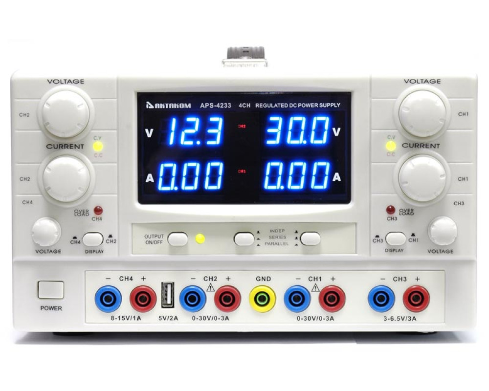 Лабораторный источник питания. Основные каналы: 2 х 30 В, 2 x 3 А. Частично регулируемые каналы: 3…6,5 В / 3 А и 8…15 В / 1 А. Максимальная мощность осн. каналов 180 Вт (90 Вт на канал). Линейный. 4 канала. 4 цифровых 3-х разрядных LED дисплея. Разрешение осн.каналов 0,1 В/0,01 А. Последовательное (60 В / 3 А) и параллельное (30 В / 6 А) соединение основных каналов. Трекинг режим. Габаритные размеры 315x255х155 мм. Вес 8,6 кг.