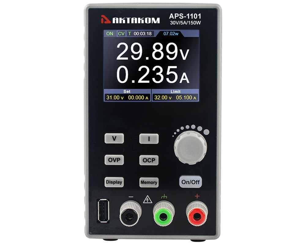 1 канал. Импульсный. Программируемый. Выходное напряжение / ток: 0…60 В / 0...5 А. Максимальная мощность 300 Вт. Выход USB 5 В/1 А. Разрешение (установка/считывание) 10 мВ/1 мА. Пульсации/шум 30 мВскз/30 мАскз. Кнопка включения/отключения нагрузки. Функция мониторинга. Работа по списку 10 групп. Сохранение 4 групп. Защита OVP, OCP с заданием. 2,8 "..