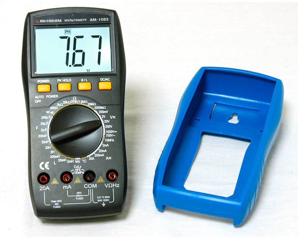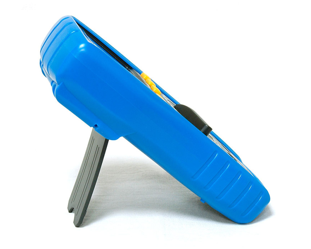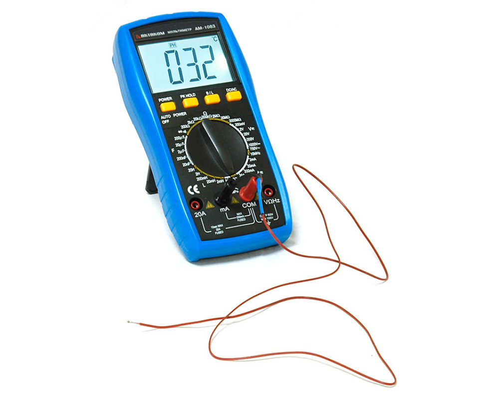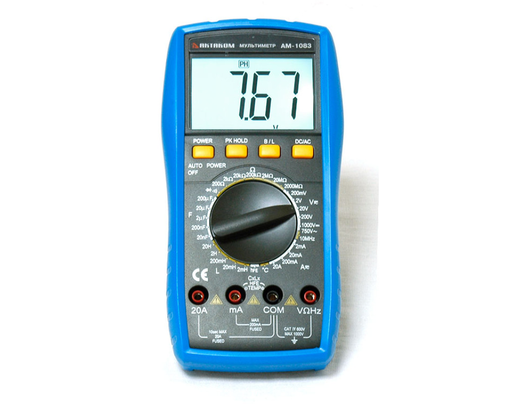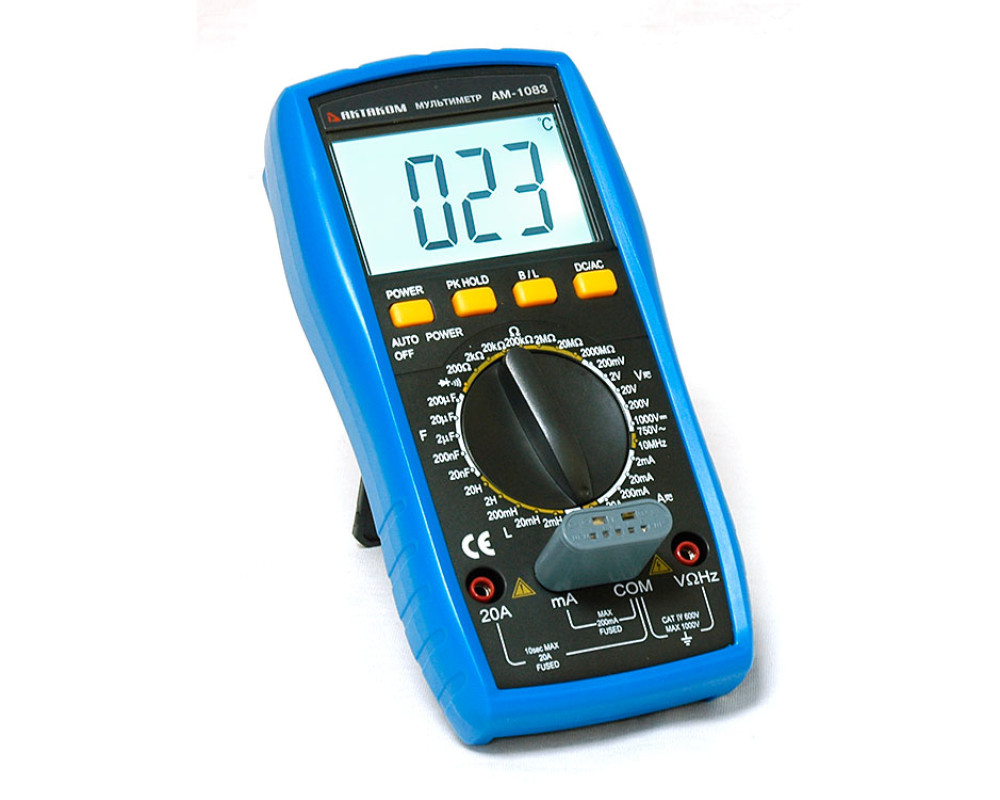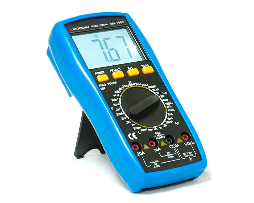 Мультиметр, ЖКИ 3 1/2 разряда (1999), базовая погрешность 0,5%. Измерение пост. напр. 1000 В ±(0,5%+3); перем. напр. 750 В ±(0,8%+5); пост. тока 20 А ±(0,8%+3); перем. тока 20 А ±(1,0%+5); сопротивления 2000 МОм ±(0,8%+3); ёмкости до 200 мкФ ±(2,5%+20); индуктивности 20 Гн ±(2,5%+4); частоты 10 MГц ±(0,5%+4); температуры (термопары K-типа) -20...1000 С ±(1,0%+4). Диапазон частот 40...400 Гц. Прозвонка цепи; тест диодов; удержание показаний; автоотключение (неотключаемое); подсветка; MIN/MAX; защита от перегрузки. Питание 9 В. Габаритные размеры 189х97х35 мм, масса 400 г.