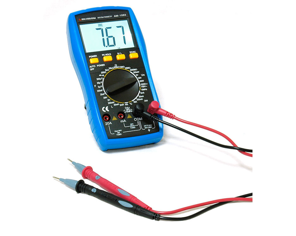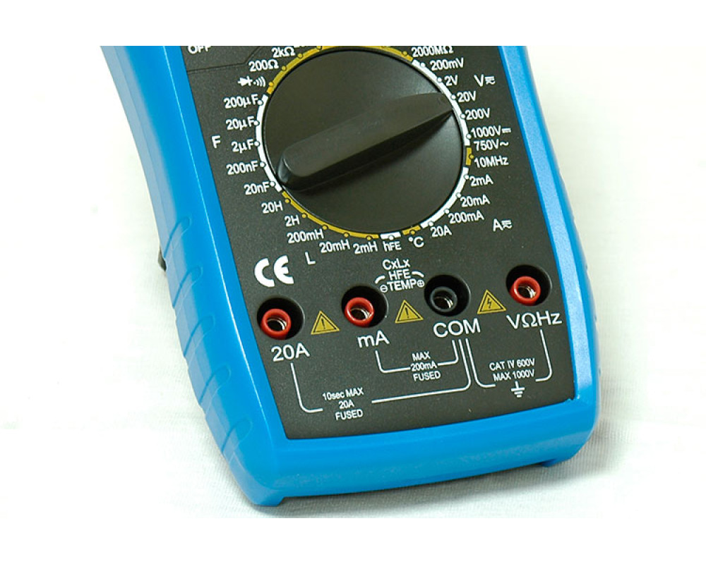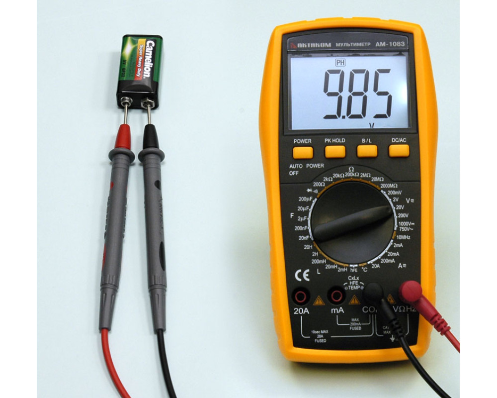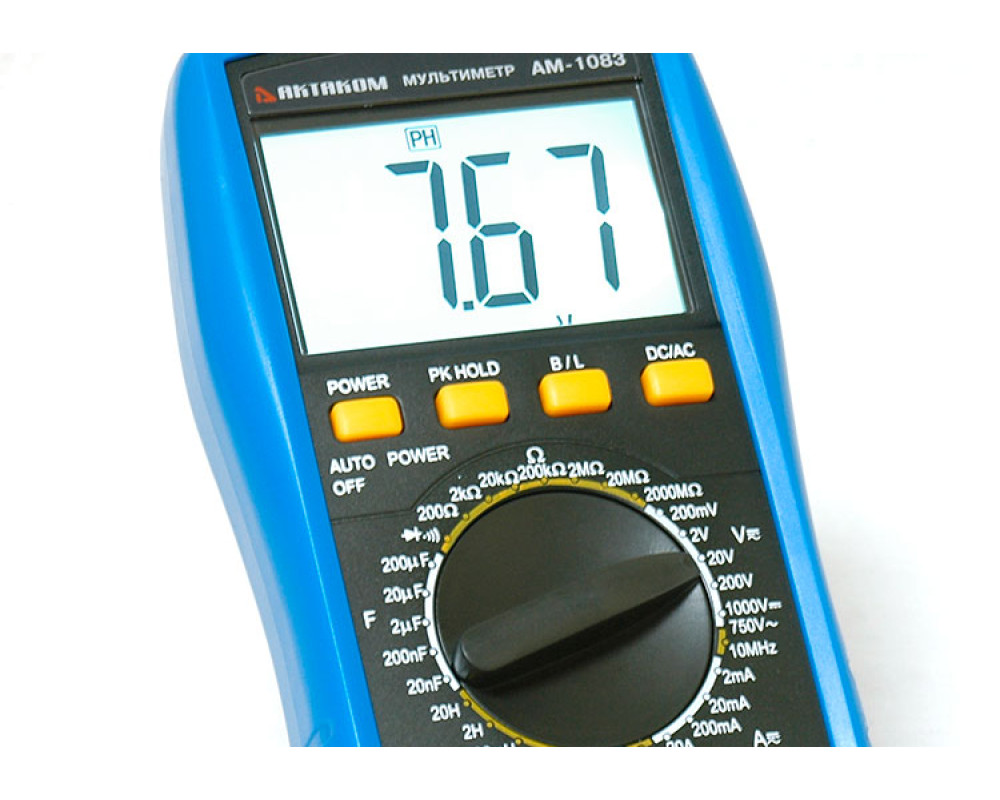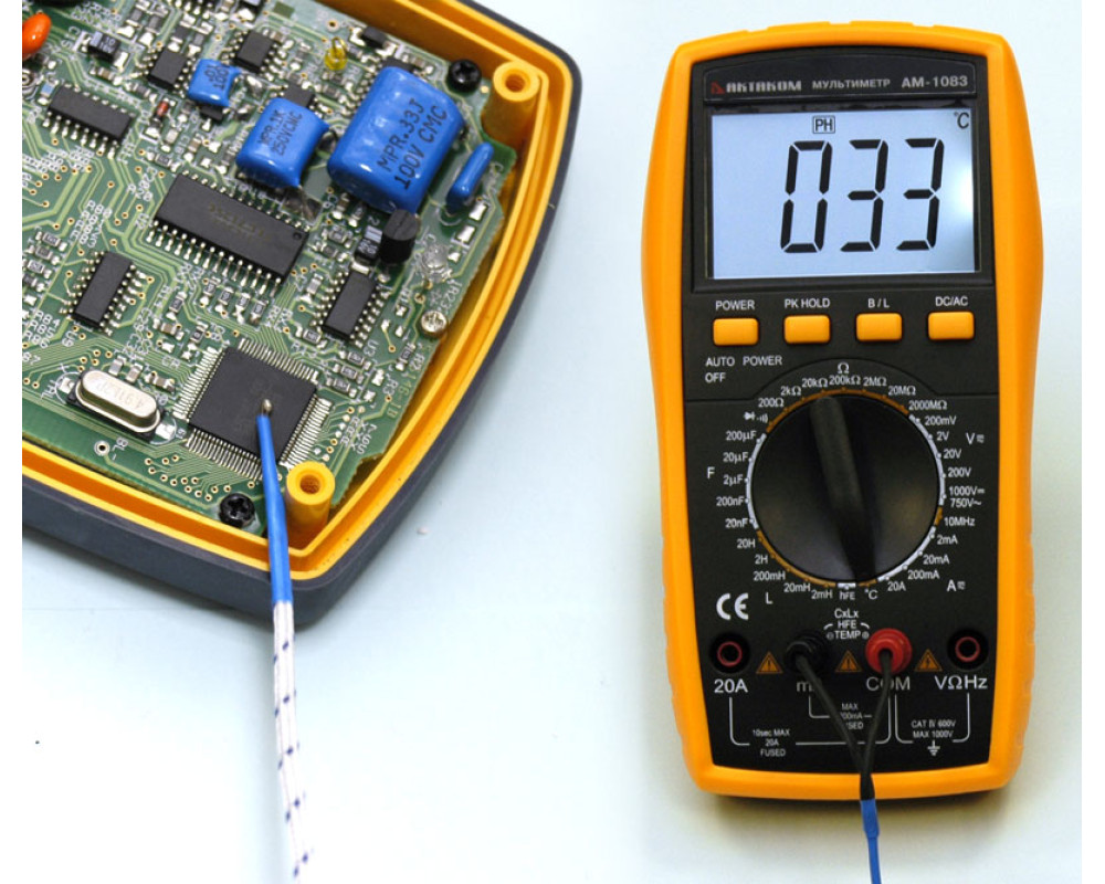 Мультиметр, ЖКИ 3 1/2 разряда (1999), базовая погрешность 0,5%. Измерение пост. напр. 1000 В ±(0,5%+3); перем. напр. 750 В ±(0,8%+5); пост. тока 20 А ±(0,8%+3); перем. тока 20 А ±(1,0%+5); сопротивления 2000 МОм ±(0,8%+3); ёмкости до 200 мкФ ±(2,5%+20); индуктивности 20 Гн ±(2,5%+4); частоты 10 MГц ±(0,5%+4); температуры (термопары K-типа) -20...1000 С ±(1,0%+4). Диапазон частот 40...400 Гц. Прозвонка цепи; тест диодов; удержание показаний; автоотключение (неотключаемое); подсветка; MIN/MAX; защита от перегрузки. Питание 9 В. Габаритные размеры 189х97х35 мм, масса 400 г.