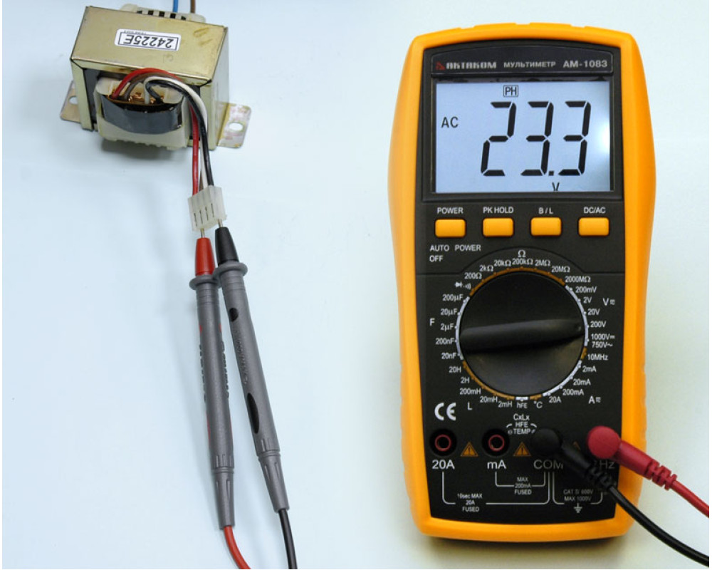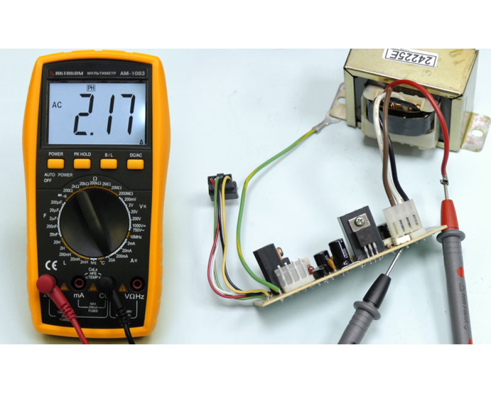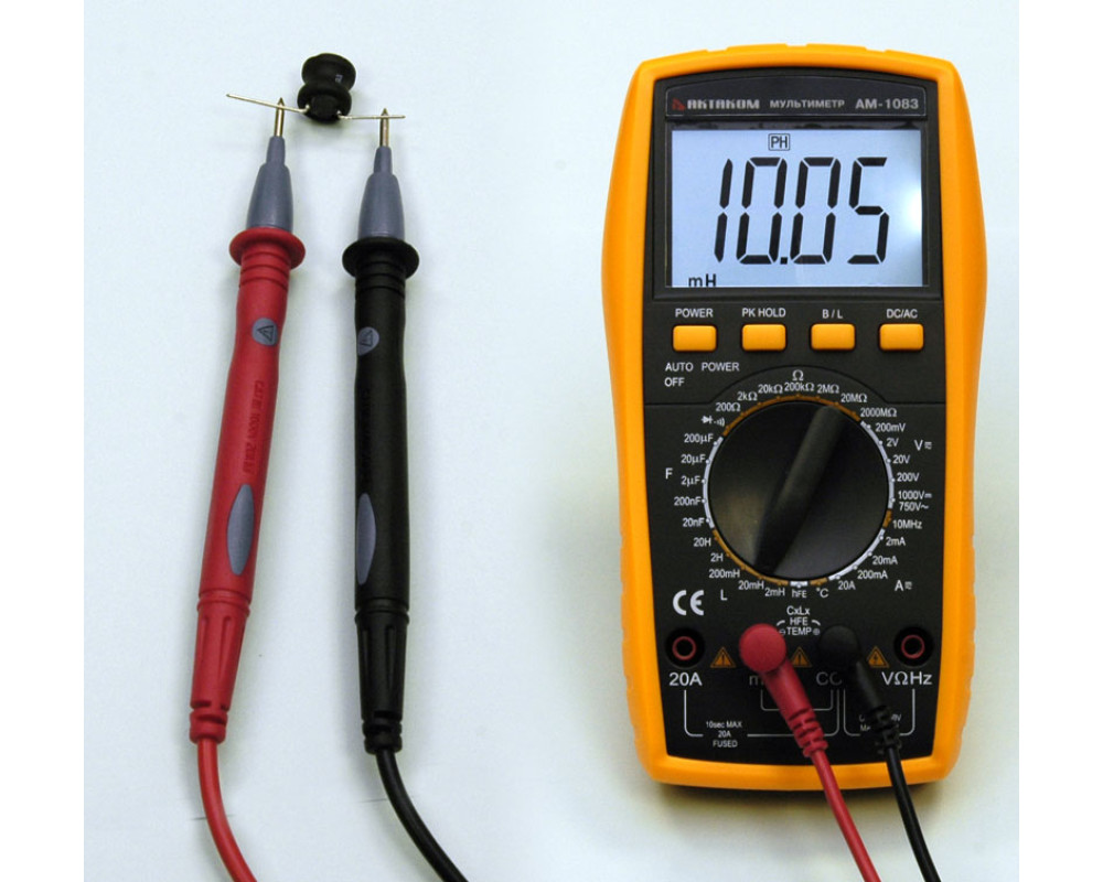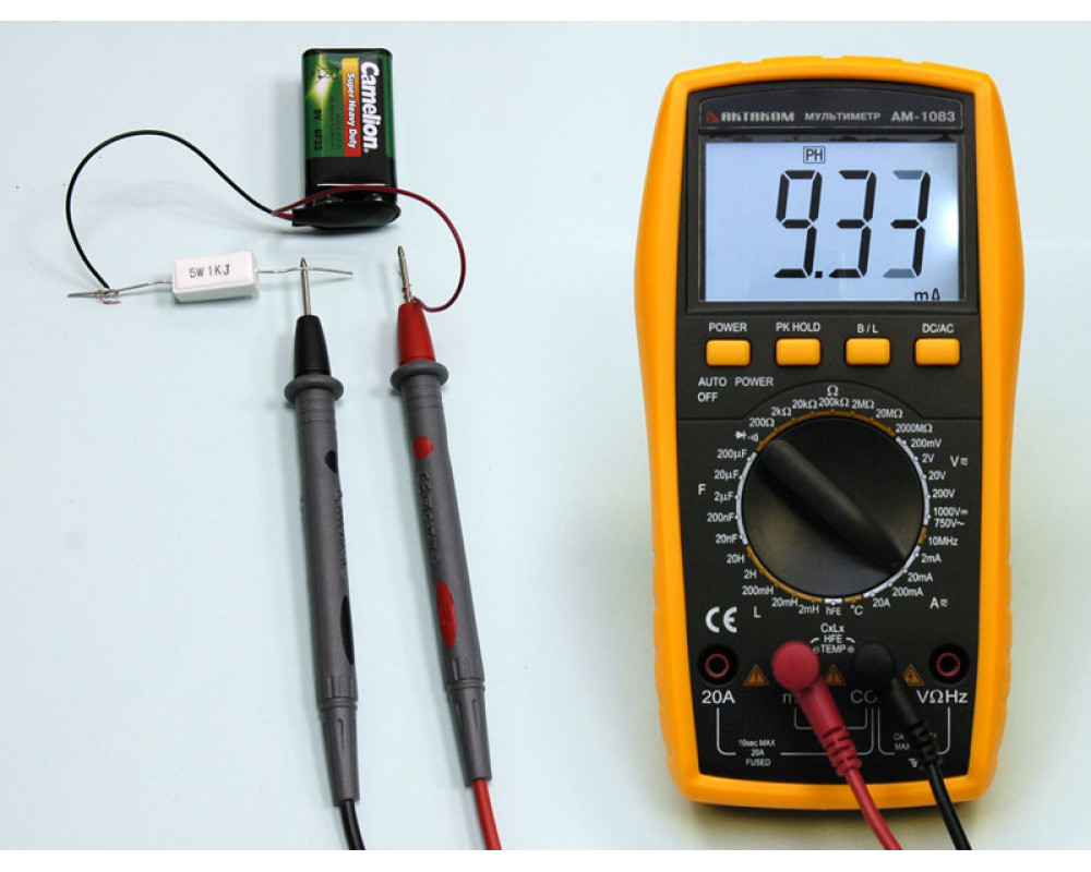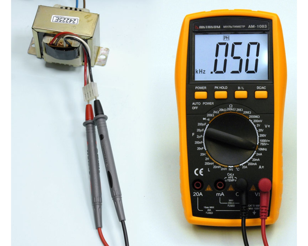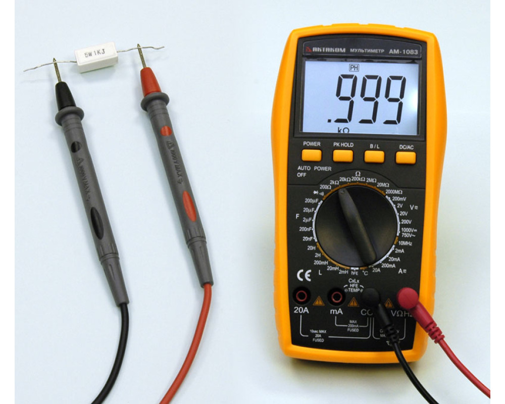 Мультиметр, ЖКИ 3 1/2 разряда (1999), базовая погрешность 0,5%. Измерение пост. напр. 1000 В ±(0,5%+3); перем. напр. 750 В ±(0,8%+5); пост. тока 20 А ±(0,8%+3); перем. тока 20 А ±(1,0%+5); сопротивления 2000 МОм ±(0,8%+3); ёмкости до 200 мкФ ±(2,5%+20); индуктивности 20 Гн ±(2,5%+4); частоты 10 MГц ±(0,5%+4); температуры (термопары K-типа) -20...1000 С ±(1,0%+4). Диапазон частот 40...400 Гц. Прозвонка цепи; тест диодов; удержание показаний; автоотключение (неотключаемое); подсветка; MIN/MAX; защита от перегрузки. Питание 9 В. Габаритные размеры 189х97х35 мм, масса 400 г.