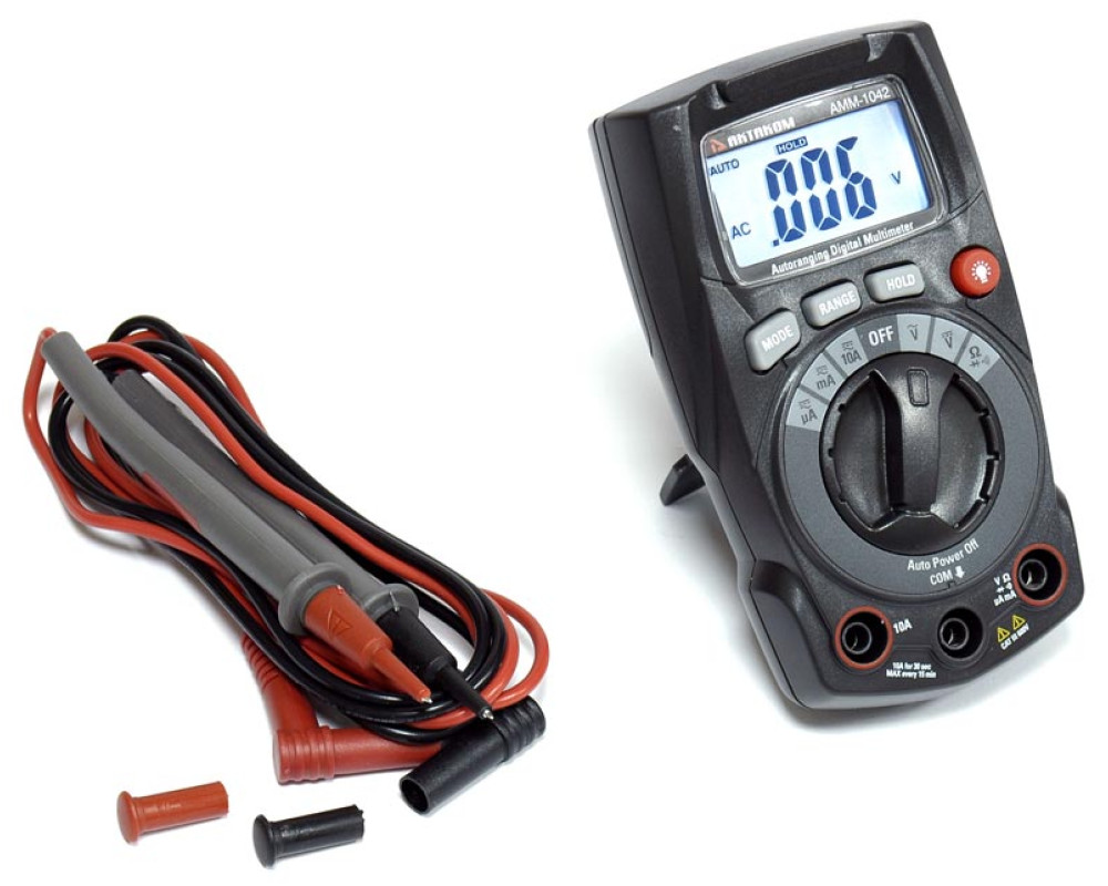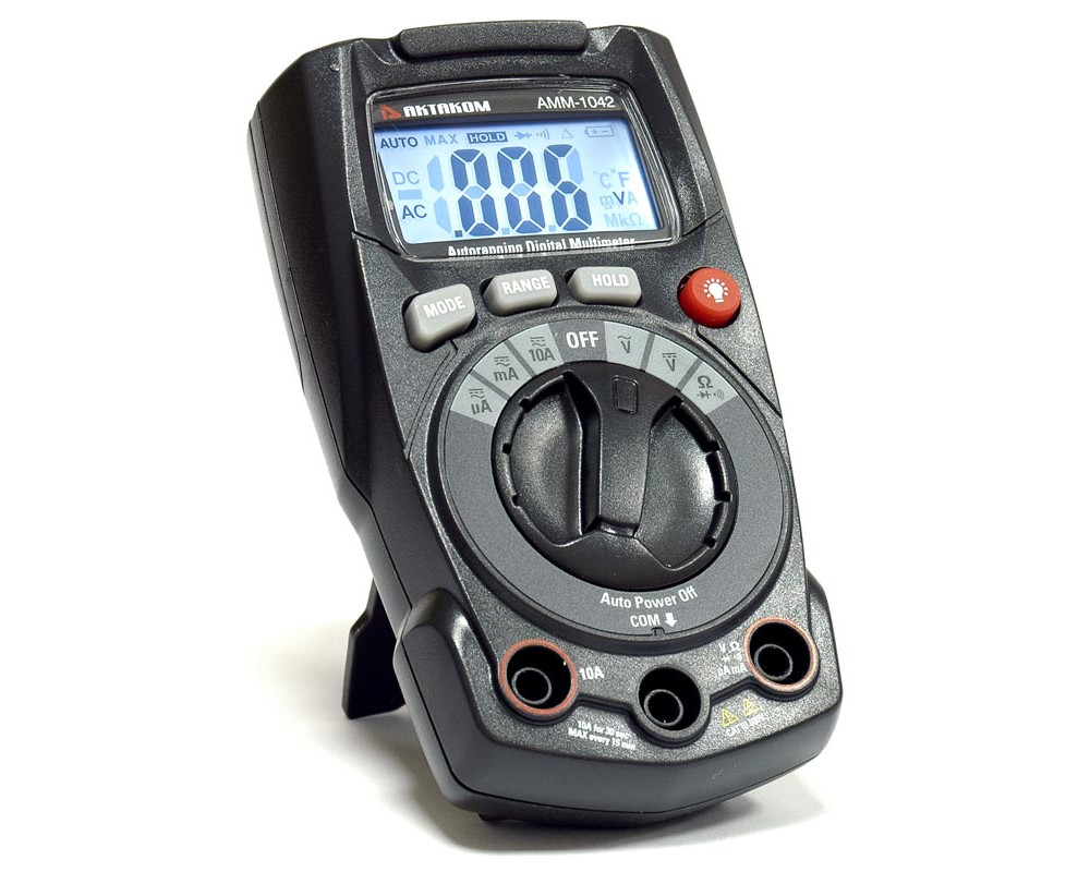 Мультиметр, ЖКИ 1999 единиц. Постоянное напряжение 600 В (±0,8%); переменное напряжение 600 В (±1,5%); постоянный ток 10 А (±1,0%); переменный ток 10 А (±1,5%); сопротивление 20 МОм (±1,0%). Тест диодов, прозвонка цепи, подсветка, удержание показаний.