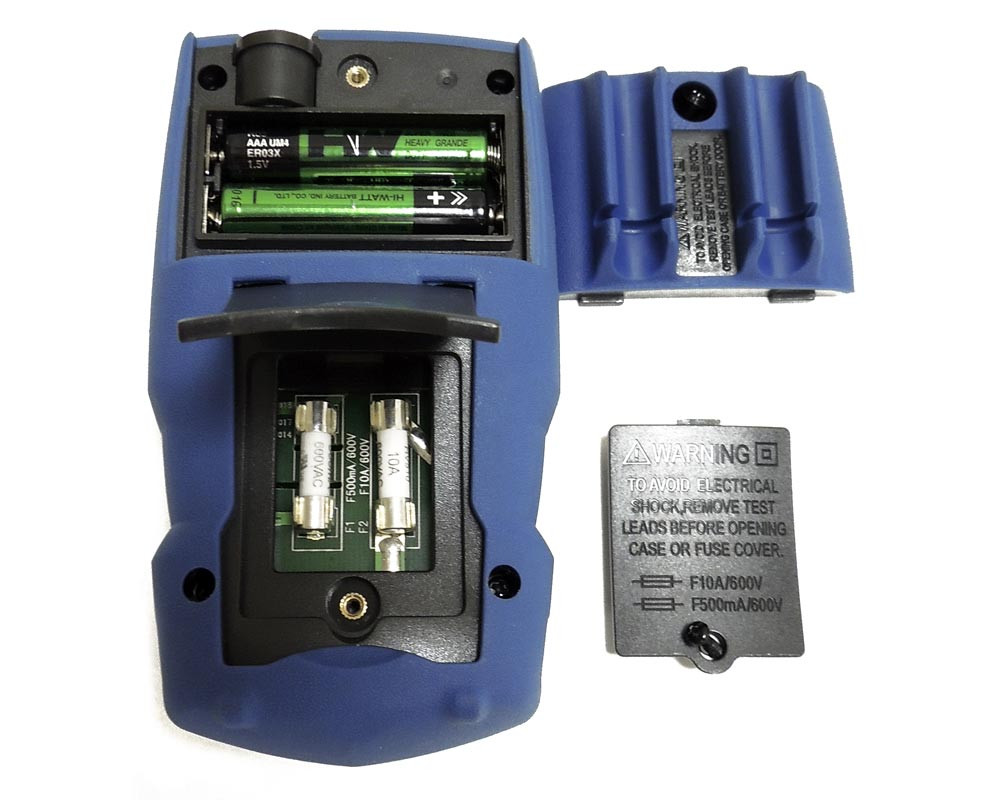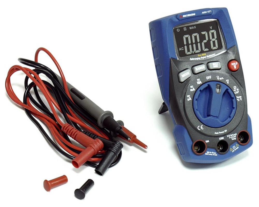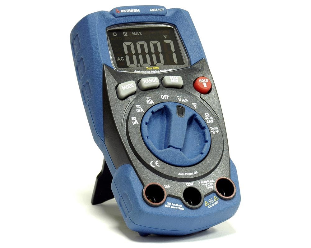 Мультиметр, ЖКИ 4000 единиц. Постоянное напряжение 600 В (±1,0%); переменное напряжение 600 В (±1,2%); постоянный ток 10 А (±1,0%); переменный ток 10 А (±1,2%); сопротивление 40 МОм (±1,5%); температура -20...760 °C. Тест диодов, прозвонка цепи, подсветка, удержание показаний.