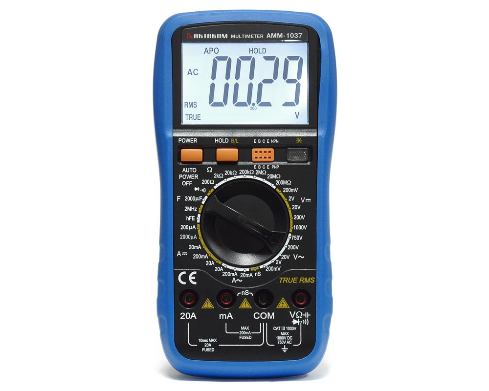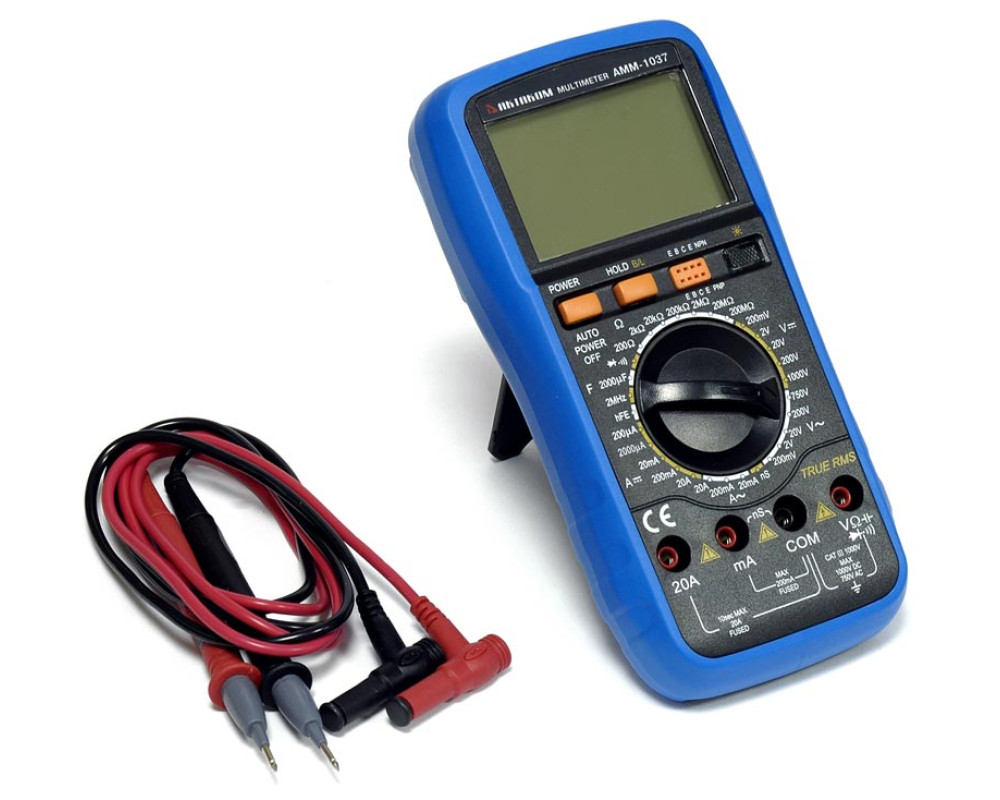 TrueRMS. ЖК дисплей, 4 1/2 разряда (19999 отсчётов). Пост. напр. 1000 В ±(0,1%+5); перем. напр. 750 В ±(0,8%+25); пост. ток 20 А ±(0,5%+4); перем. ток 20 А ±(1,5%+15); сопротивление 200 МОм ±(0,4%+5); ёмкость 2000 мкФ ±(4,0%+50); индуктивность 20 Гн ±(2,5%+30); проводимость 0,1-100 нС (1,0%+30); частота 2 МГц (0,1%+3); тест диодов; прозвонка. Скорость измерения 3 раза/сек. Удержание показаний. Автовыключение. Ручной выбор диапазона. Индикатор разряда батареи. Питание 9 В типа Крона. Габаритные размеры 190х88.5х27.5 мм. Вес 422 гр.