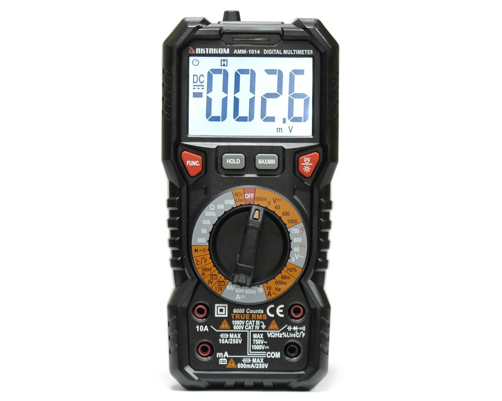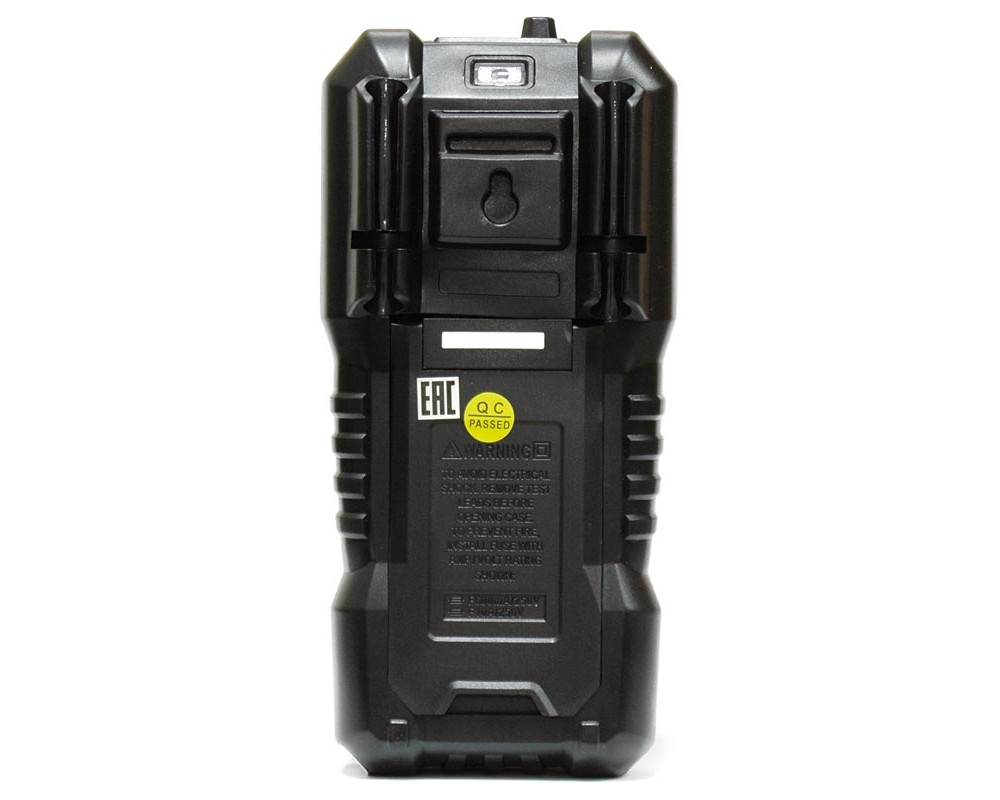 TrueRMS (10-1000 Гц). ЖКИ с подсветкой, 6000 отсчётов. Постоянное напряжение 1000 В (±0,5%); переменное напряжение 750 В (±0,8%); постоянный ток 10 А (±1,2%); переменный ток 10 А (±1,5%); сопротивление 60 МОм (±1,0%); ёмкость 100 мФ (±4,0%); частота 10 МГц (±1,0%); коэффициент заполнения 1-99%, температура -20…1000 °С, тест диодов; прозвонка. Бесконтактный датчик напряжения. Определение проводника под фазой. Тестирование батарей. Удержание показаний, MAX/MIN. Защита от перегрузок CAT IV 600В; CAT III 1000В. Индикатор разряда. Питание 3 В (2 бат. АА). Размеры 175х93х55 мм. Масса 400 г.