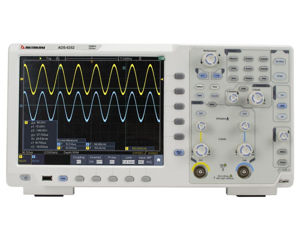 2 канала. Полоса пропускания - 350 МГц. Частота дискретизации - 5 Гвыб/с. АЦП 8 бит. Макс. память - 400 М точек. Скорость захвата 600000 осц/сек. Верт. отклонение 1 мВ/дел - 10 В/дел. Гор. развертка 1нс/дел - 1000 нс/дел . Входной импеданс: 1 МОм/50 Ом. 31 автоизмерение. Запуск: фронт, видео, импульс, скорость нарастания, рант, окно, ожидание, N фронт, логика, посл.шина. Анализатор протоколов I²C, SPI, RS-232, CAN. Мультиметр 4 1/2 разряда с регистратором. Генератор сигналов 50 МГц. Измеритель АЧХ (диаграммы Боде). Частотомер. Интерфейс: USB-host, USB-device, LAN. Выход Trig Out (Pass/Fail), VGA. Вес: 5,0 кг. Размеры: 421 x 221 x 115 мм.