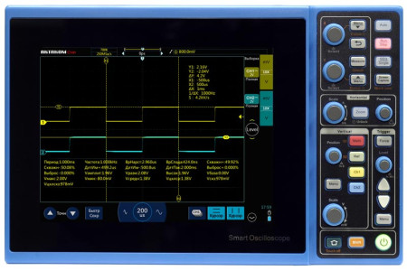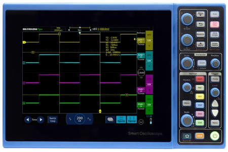Осциллограф планшетного типа. Полоса пропускания 70 МГц. 2 аналоговых канала. Максимальная дискретизация 1 Гвыб/с. Максимальная длина записи 40 М точек. Скорость захвата осциллограмм 45000 осц./с. Вертикальное разрешение 8 бит. Коэффициент отклонения 1 мВ/дел - 10 В/дел. Горизонтальная развертка 2 нс - 1000 с/дел. 13 типов запуска. Цифровой мультим..