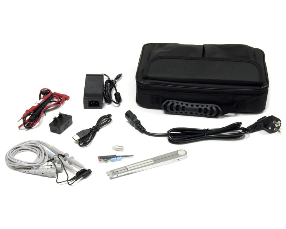 Осциллограф-мультиметр-генератор. Полоса пропускания 200 МГц. 2 аналоговых канала. Максимальная дискретизация 1 Гвыб/с. Максимальная длина записи 8 К точек. Скорость захвата осциллограмм 10000 осц/с. Вертикальное разрешение 8 бит. Цифровой мультиметр (TrueRMS, 20000 отсчетов, независимые входы). Генератор сигналов (25 МГц, 1 канал, 14 бит). Интерфе..