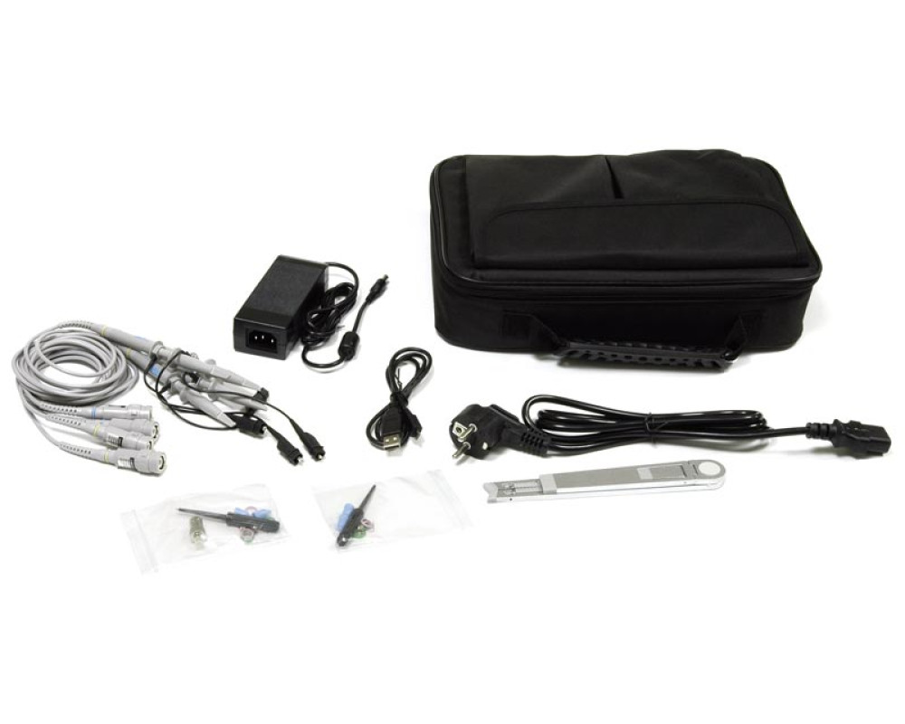 Осциллограф планшетного типа. Полоса пропускания 70 МГц. 2 аналоговых канала. Максимальная дискретизация 1 Гвыб/с. Максимальная длина записи 40 М точек. Скорость захвата осциллограмм 45000 осц./с. Вертикальное разрешение 8 бит. Коэффициент отклонения 1 мВ/дел - 10 В/дел. Горизонтальная развертка 2 нс - 1000 с/дел. 13 типов запуска. Цифровой мультим..
