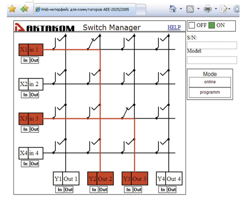 Прибор АЕЕ-2027 является матричным коммутатором сигналов с электронным управлением. Матрица коммутации имеет 4 входа и 4 выхода и обеспечивает возможности коммутации 1 входа на 1 выход. Выполнен в виде приставки к компьютеру (ПК). Управление коммутацией осуществляется программно от компьютера через интерфейс USB или дистанционно через сетевой интер..